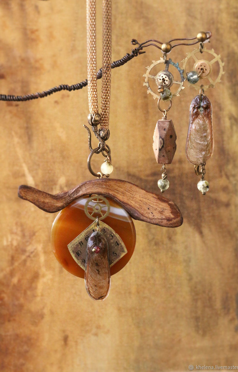 стильные украшения, оливковый цвет, комплект с пренитом, подвес с морским деревом, комплект с деталями часов, серьги с шестеренками, колье с циферблатом, комплект украшений бохо купить, современный дизайн украшений, Подвес с агатом, цикада, комплект с сухоцветами, стиманк украшения, коричнево-золотистый комплект