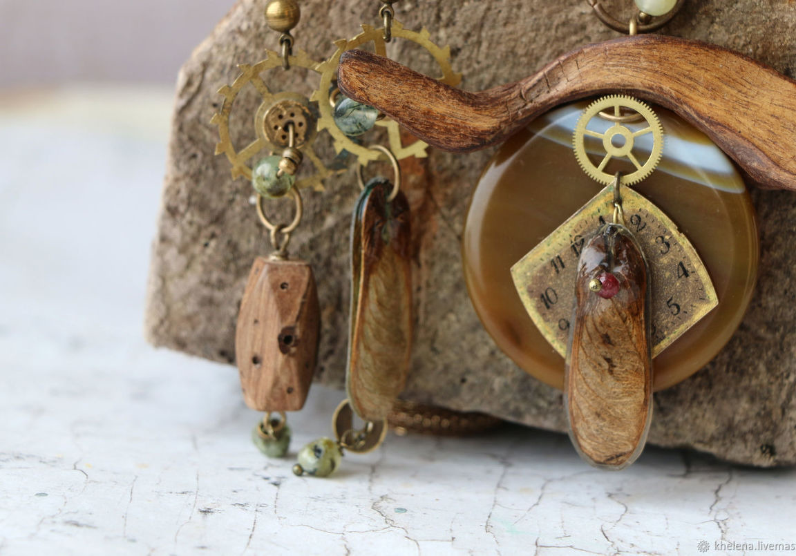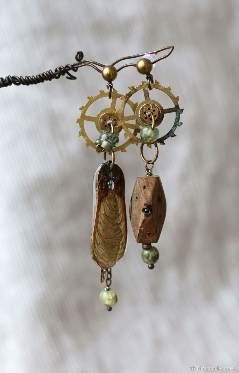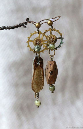 И асимметричные серьги из шестеренок от старого будильника, еще одной крылатки ясеня и деревянной бусины, декорированной пирографией. На одной из шестеренок я оставила естественную патину.