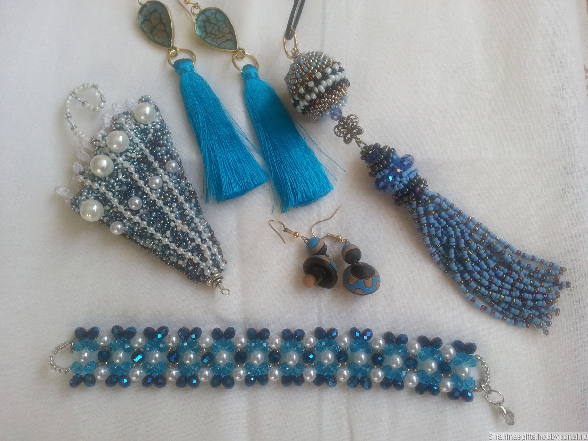 Комплект состоит из 5 предметов: 1.Медальон из Бисера 2. серьги из глины 3.Серьги шелковой нити 4. Брошь 5. браслет