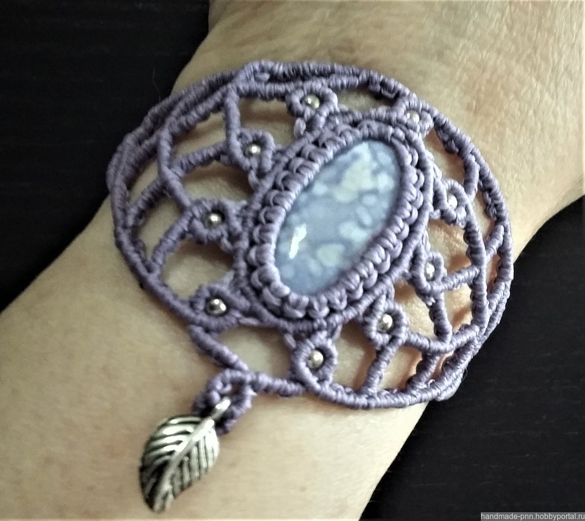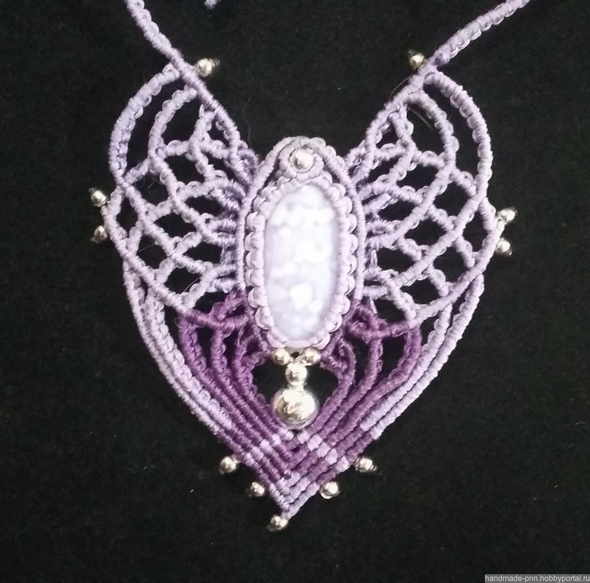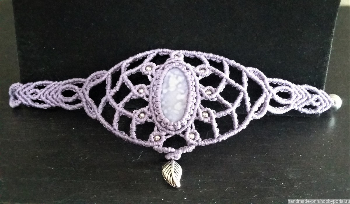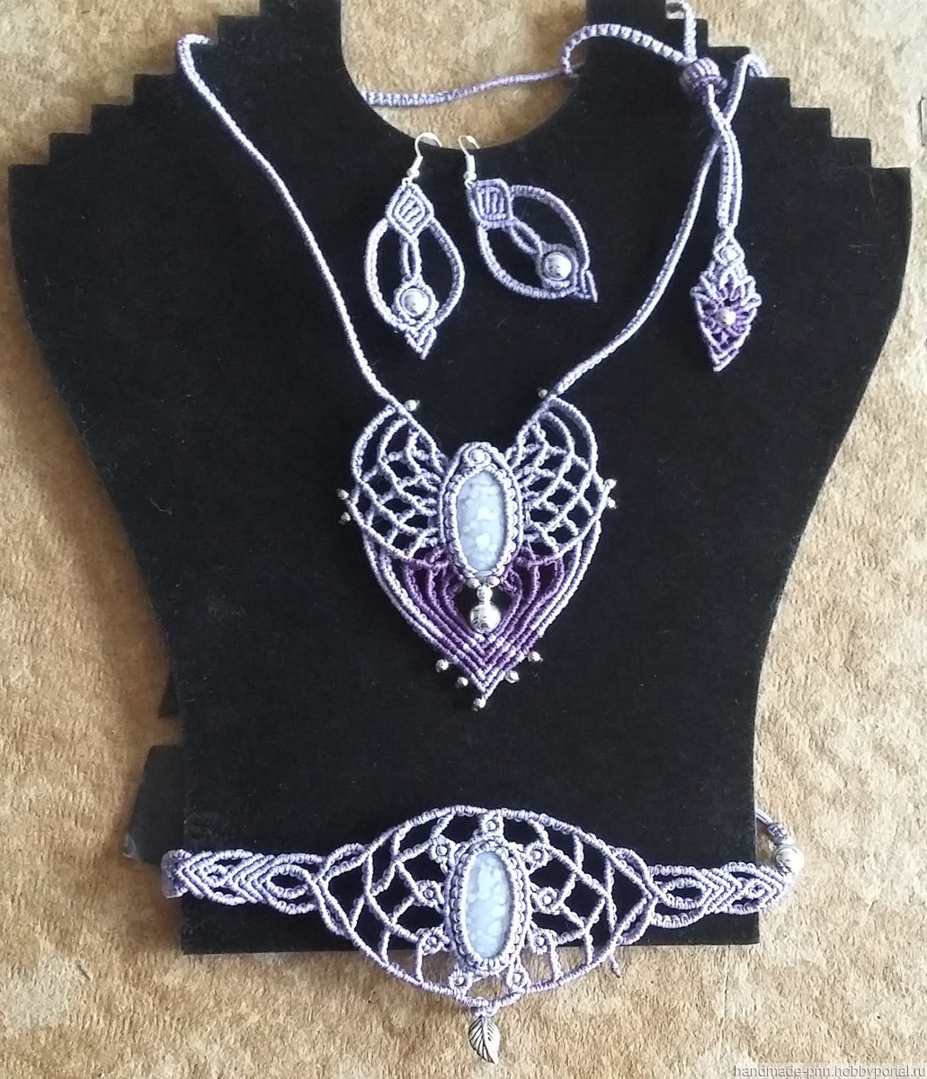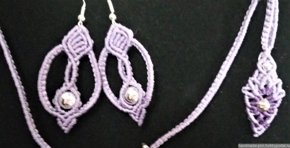Комплект выполнен в технике макраме из вощеной синтетической нити сиреневого и фиолетового цветов с металлическими и акриловыми серебристымии бусинами. В центре колье и браслета вплетены бусины из раковин размером 30 х 15 мм. Длина колье и браслета регулируется с помощью скользящей застежки.