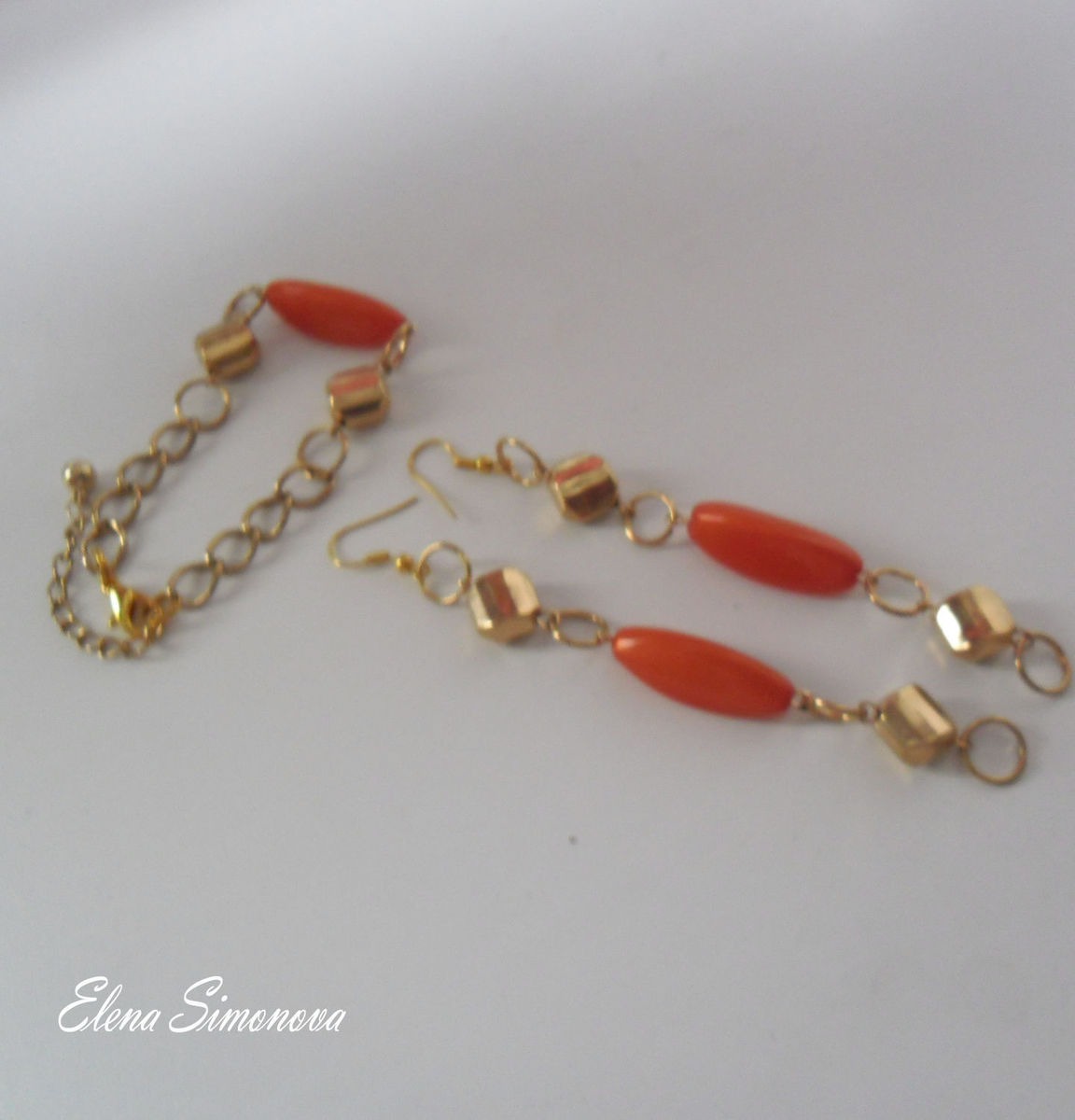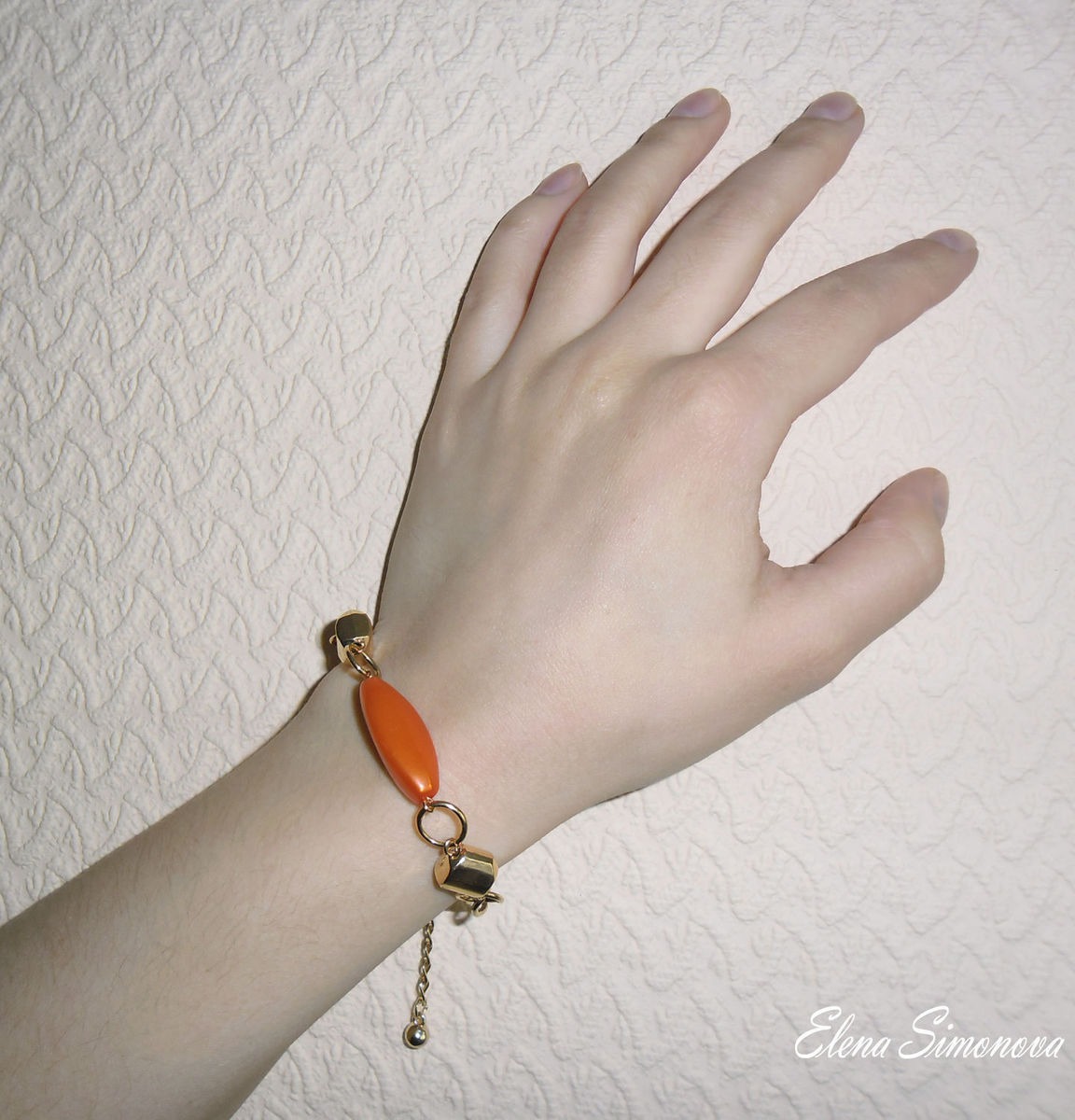 оранжевый, браслет, комплект украшений, рыжий, серьги длинные, длинные сережки, фурнитура под золото, декоративный пластик, цепочка под золото