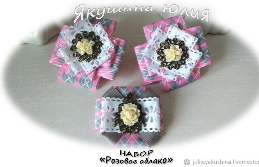 Винтажный набор состоит из трёх изделий: два бантика на резинке для волос и брошка на булавке. Набор украсит школьную форму. Набор украсит школьную форму вашей маленькой модницы. Работа выполнена достаточно прочно. Бантик не оторвётся спустя несколько нескучных перемен, а если вдруг забудете перед стиркой снять с платья брошку, то она прекрасно переживёт стирку в стиральной машине.