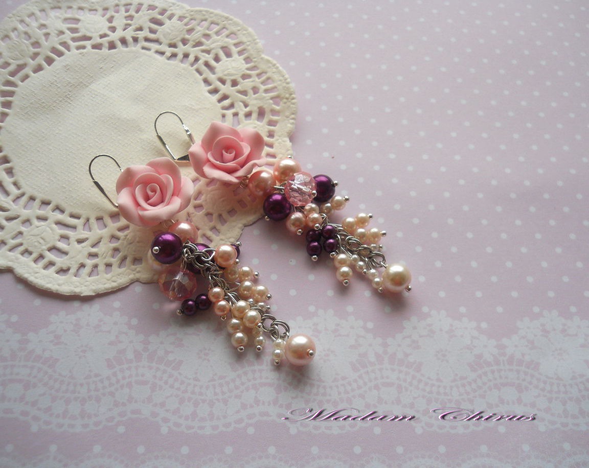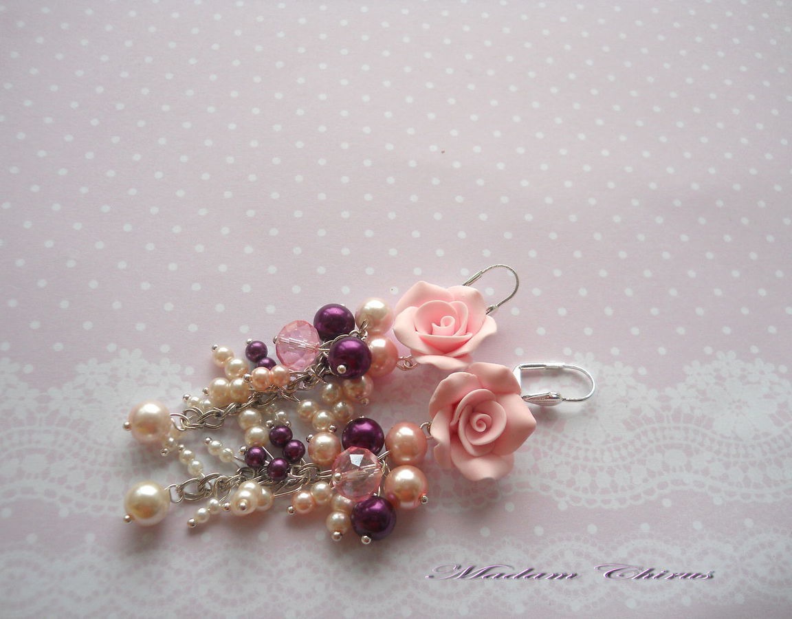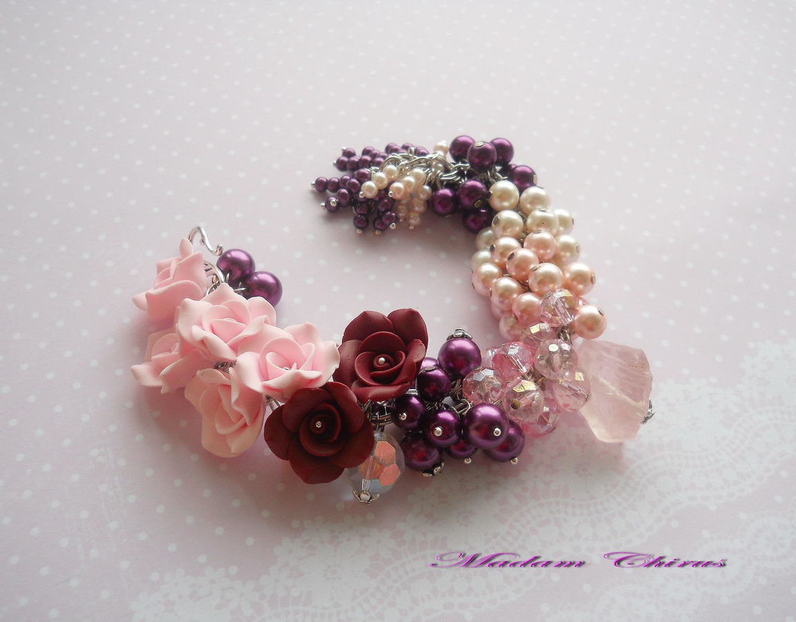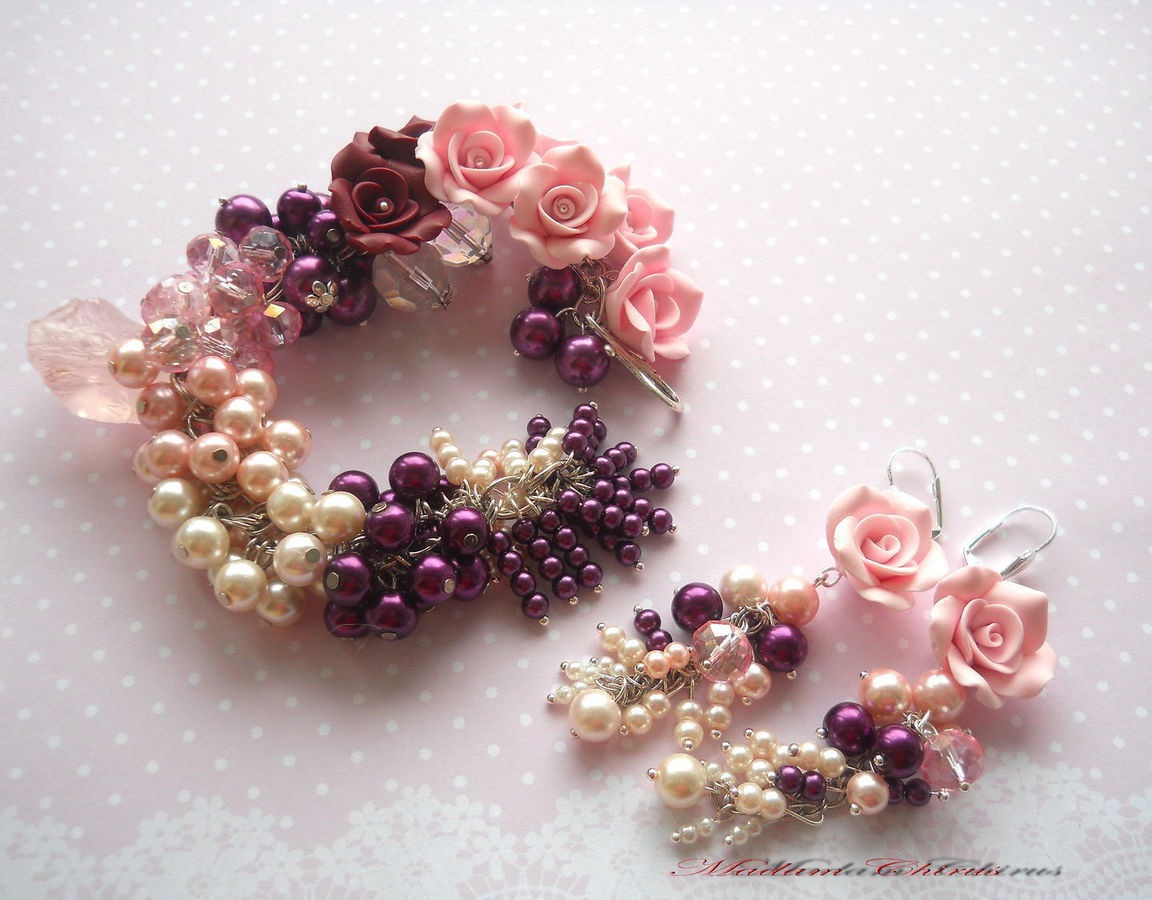 комплект украшений, комбинированный, розовый кварц, длинные серьги, розовый браслет, сливовый, бардо, бардово - розовый, комплект из полимерной, пышный браслет, браслет с розами, розы из полимерной глины