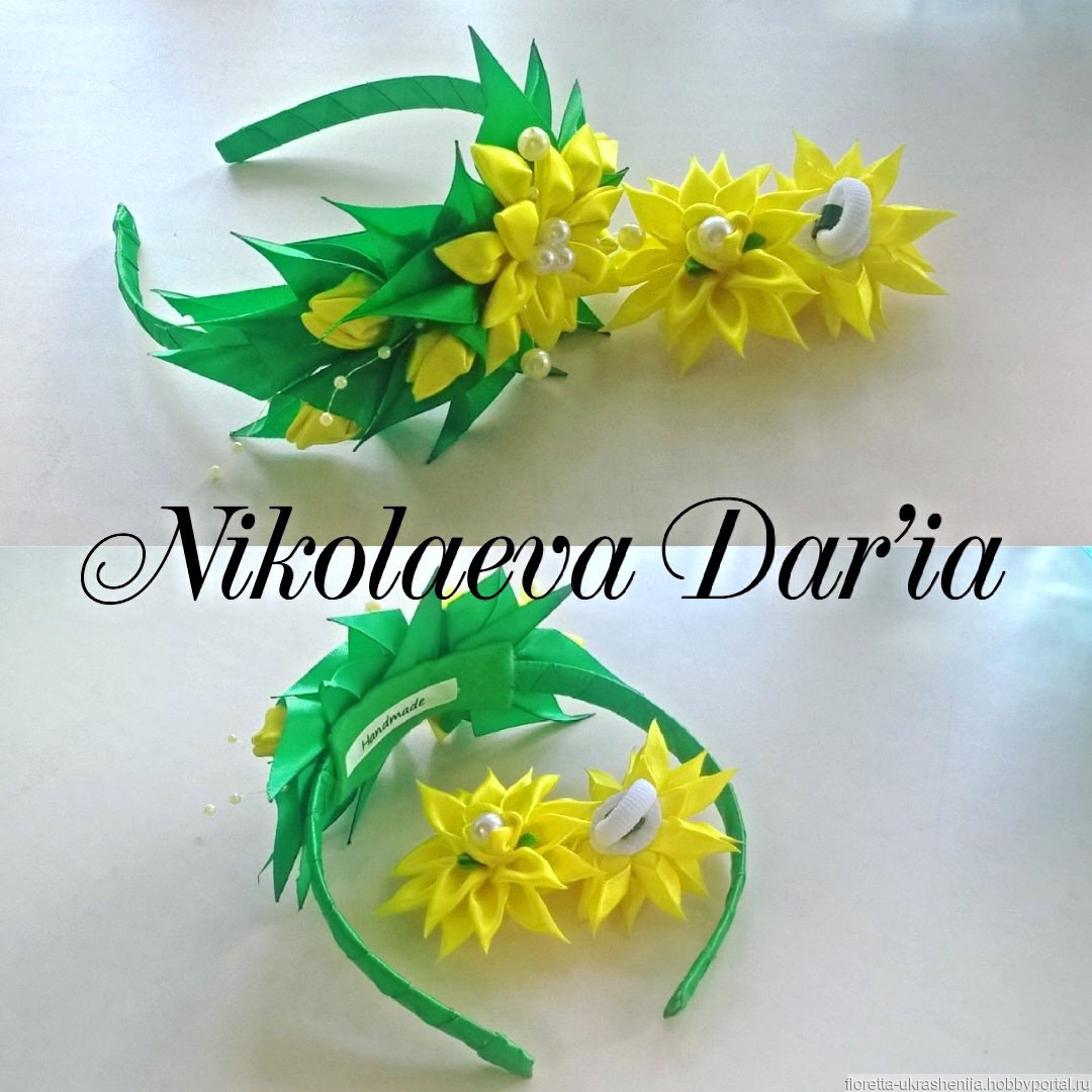 обруч для волос, желто-зеленый, Летний комплект, резинки, канзаши ручная работа