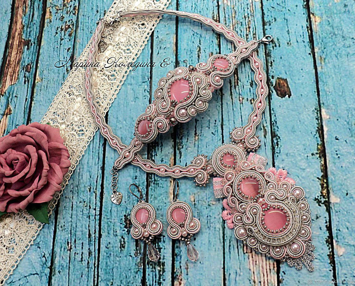 Материалы: сутаж, стеклянные кабошоны, стеклянные бусины, чешский бисер, японский бисер, кружево, изнанка замша, фурнитура нержавеющая сталь, швензы с французским замком.