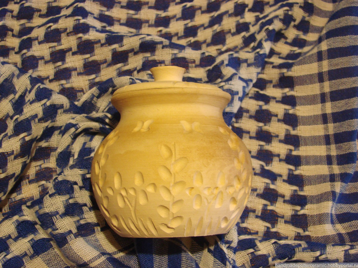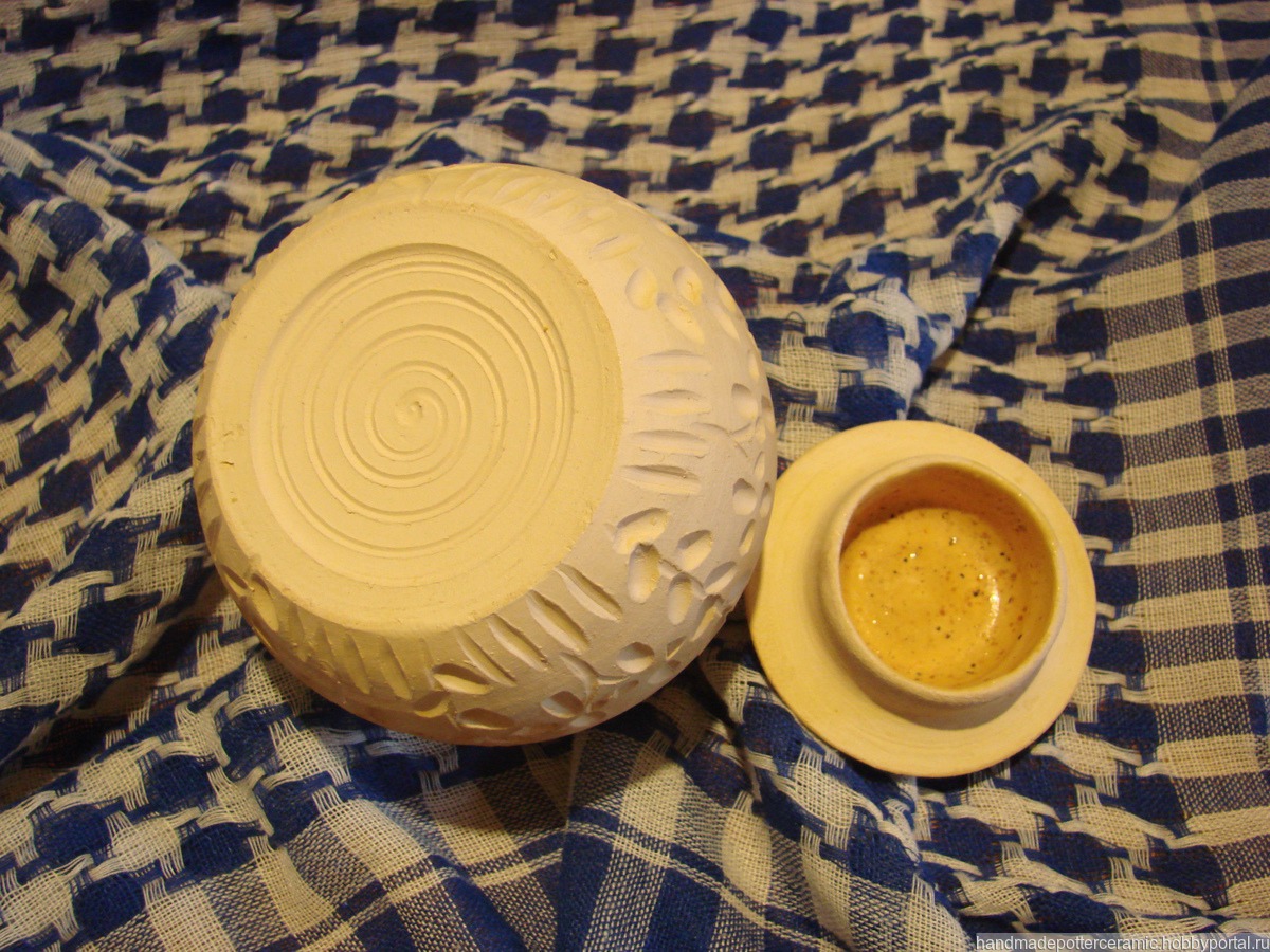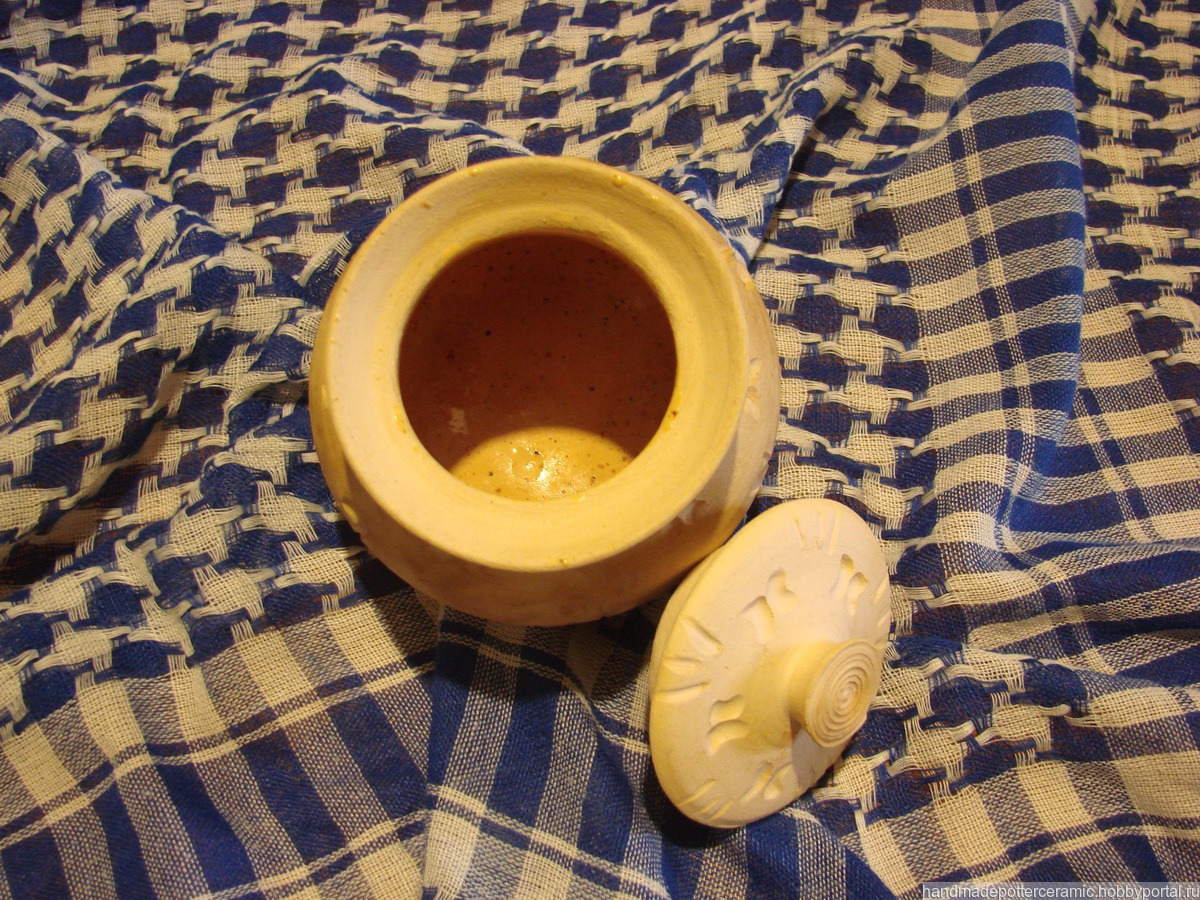 Сахарница с крышкой сделана вручную из глины, внутри покрыта песчаного цвета с вкраплениями глазурью, крышка тоже, снаружи вырезан узор и замолочена (покрыто молоком и обожжено при 350 градусах), из-за этого мыть ее в посудомойке крайне нежелательно.