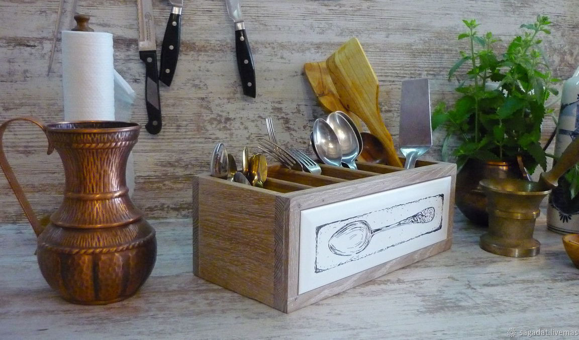 Моя авторская идея, исполнение, чертежи. Полностью собственная разработка, начиная от подбора материалов до чертежей для эффективного размещения на кухне. Вещи не утилитарные, дорогие, добротные, из ценного дорогого дерева с использованием профессиональных материалов. Теперь подробно. Короб для столовых приборов, других необходимых мелочей на кухне, из массива Дальневосточного дуба. Большой, вместительный, удобный, массивный, устойчивый. В работе использованы только масла и воски, никакого лака! Лак неприемлем для твердых пород древесины, сейчас ХXI век, существует масса профессиональных материалов, защищающих древесину от пересыхания, переувлажнения, от грибков, плесени и пр. Да, они дороги, пользуются такими материалами очень немногие, но дорогое дерево достойно такого обрамления. Снаружи органайзеры с эффектом выбеленного дуба, внутри обработаны в несколько этапов защитными маслами и восками. Идеально гладкий. Вставка итальянская керамическая плитка, я подбирала и заказывала сегменты специально для этой коллекции. Плитка вклеена в органайзер в рамку, не накладная. Работа серьезная и продуманная, отсюда и стоимость. Добра и уюта дому!