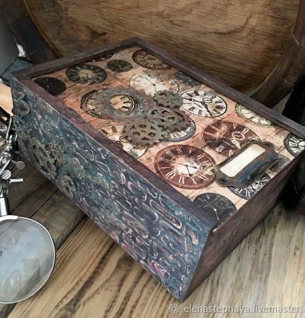 акриловые краски, металлическая фурнитура, Декупажная карта, штампы, трафарет, дерево, лак