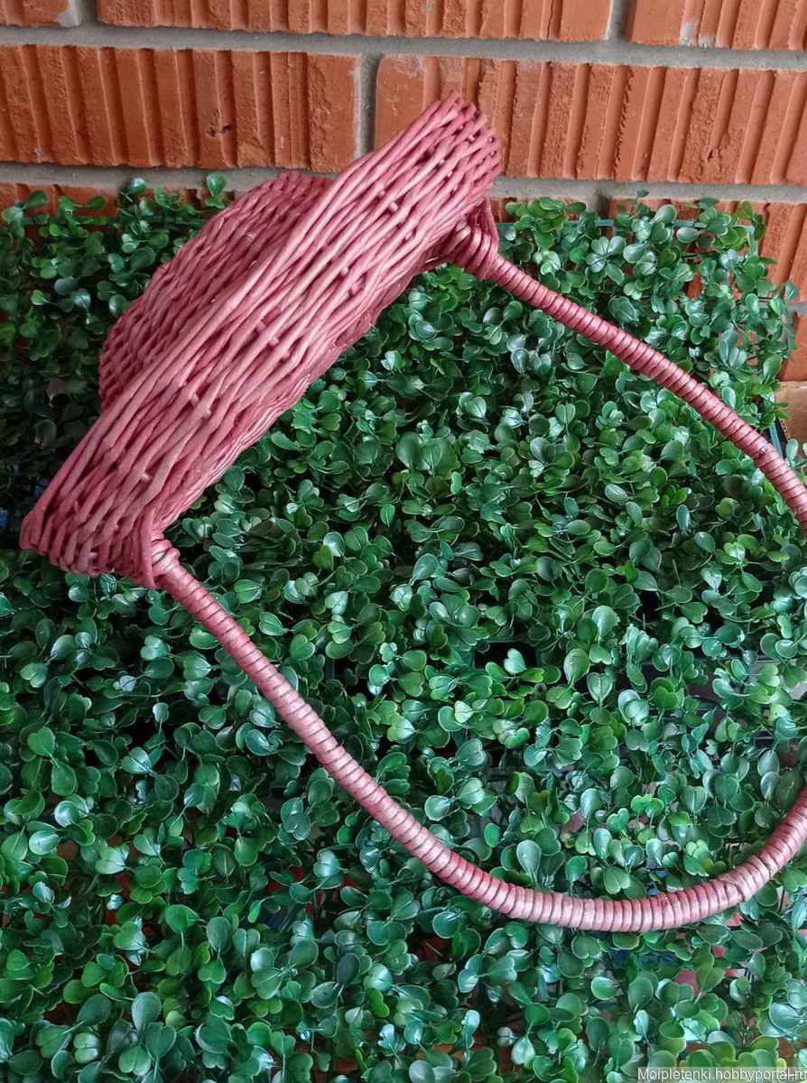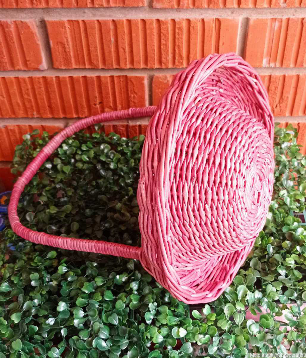 Корзинка с длинной ручкой из бумажной лозы. Цвет красное дерево. Диаметр - 24 см, высота корзинки- 7 см, высота корзинки с ручкой - 34 см.