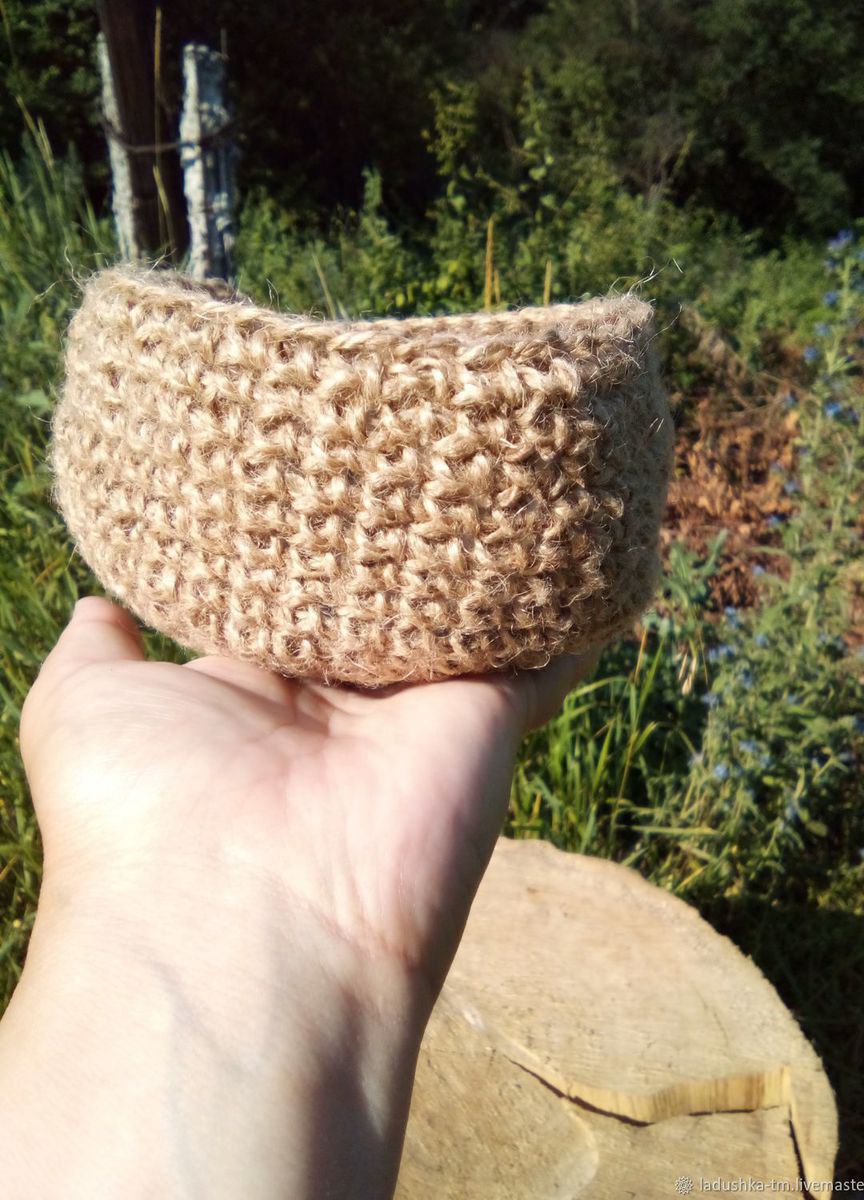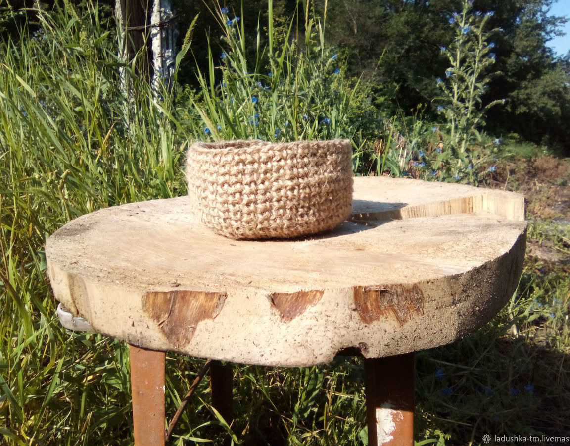 Корзинка мягкая из джута.Размер 12 см. по дну и 9 см. в высоту. Корзинку можно завернуть на любую высоту и под свой вкус изменить ее вид (например, сделать совсем низкой и широкой). Может использоваться как кашпо для цветов. В этой корзине можно хранить различные мелкие вещи, уходовую косметику в ванной комнате, на кухне, в гостиной - фрукты, - ограничений нет. Такие корзинки экологичные, прочные, удобные. Если связать набор таких корзин, то можно в одном стиле оформить любой домашний уголок. С ними в вашем доме поселятся уют, порядок и красота! Как использовать - решать только вам. А я помогу реализовать ваши желания.