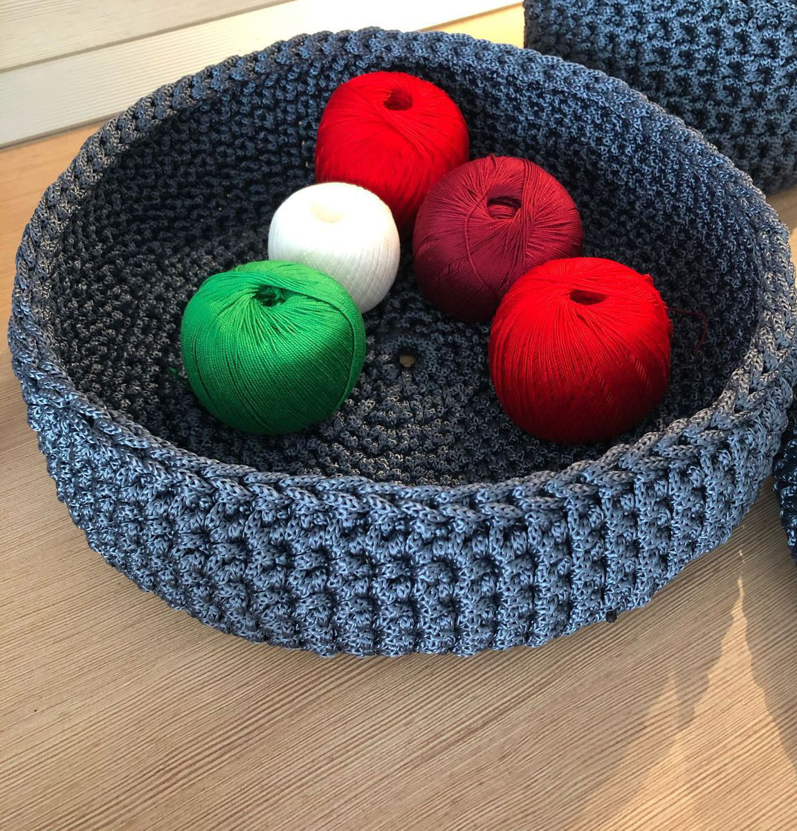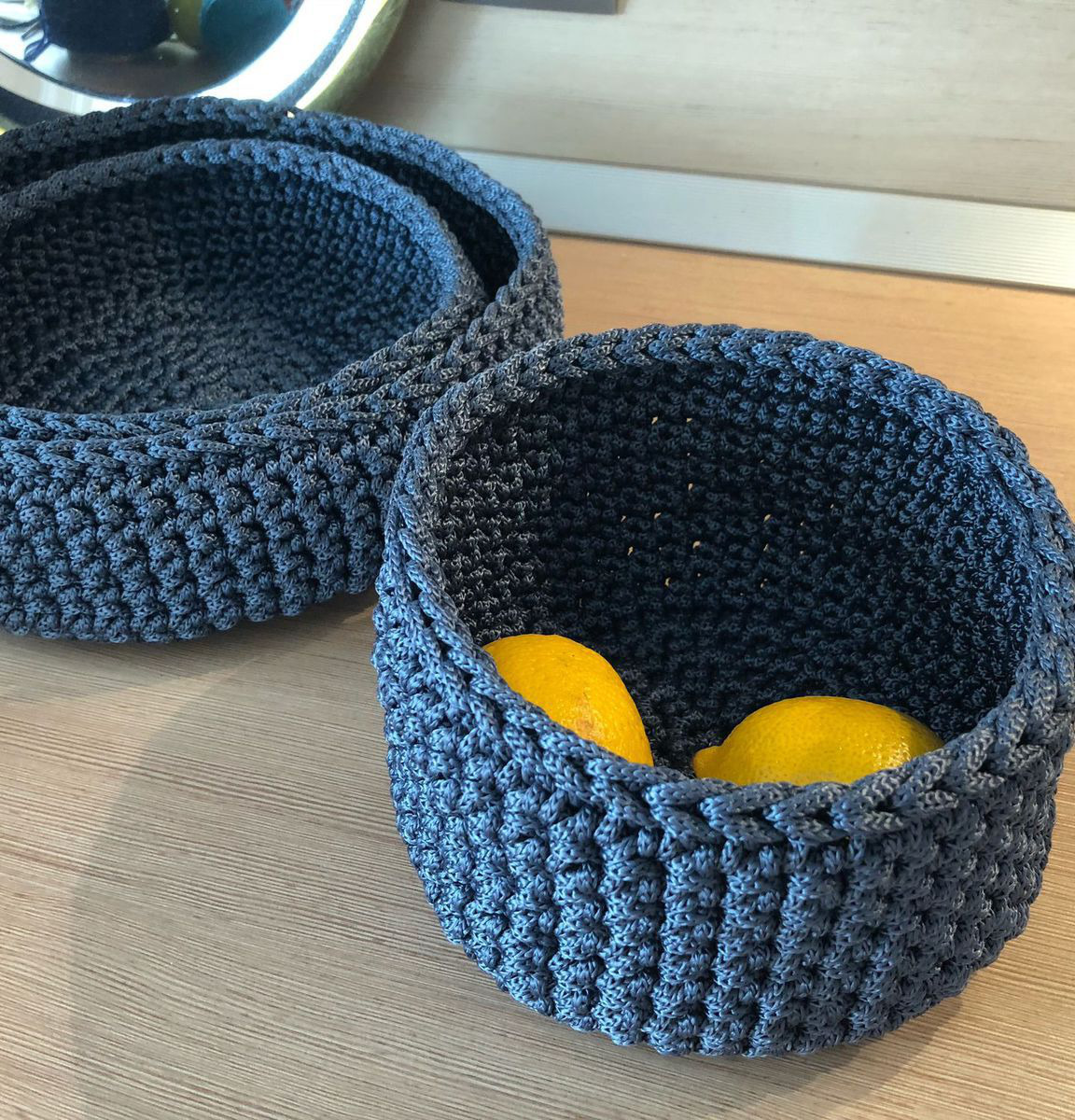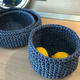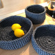 Набор вязаных корзиночек для различных мелочей, сладостей, фруктов или средств по уходу, нижнего белья или носочков, можно приспособить в прихожую у входа для ключей и мелочей которые необходимо взять с собой или для чего душа пожелает. Из полипропиленового шнура, держит форму, не боится воды, 27х8, 22х8, 17х11 см