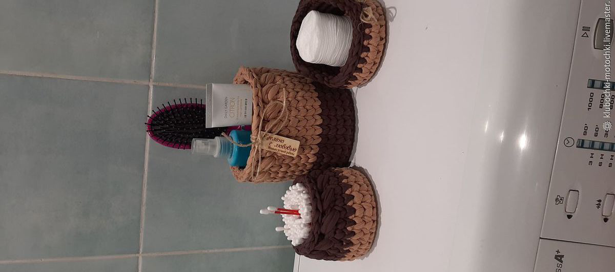 Хлопковое вязаные корзиночки помогут вам аккуратно разместить ватные палочки .диски,расчёски и другое.Хороший и нужный подарок для ваших друзей.Могу выполнить в любом цвете.Деревынные донышки создают дополнительную устойчивость .