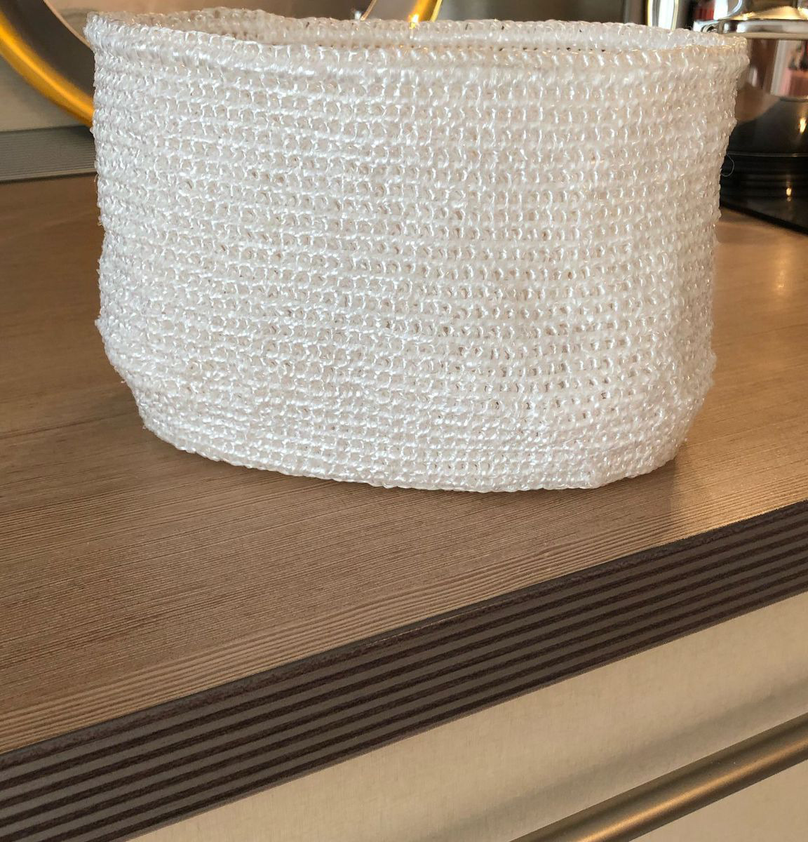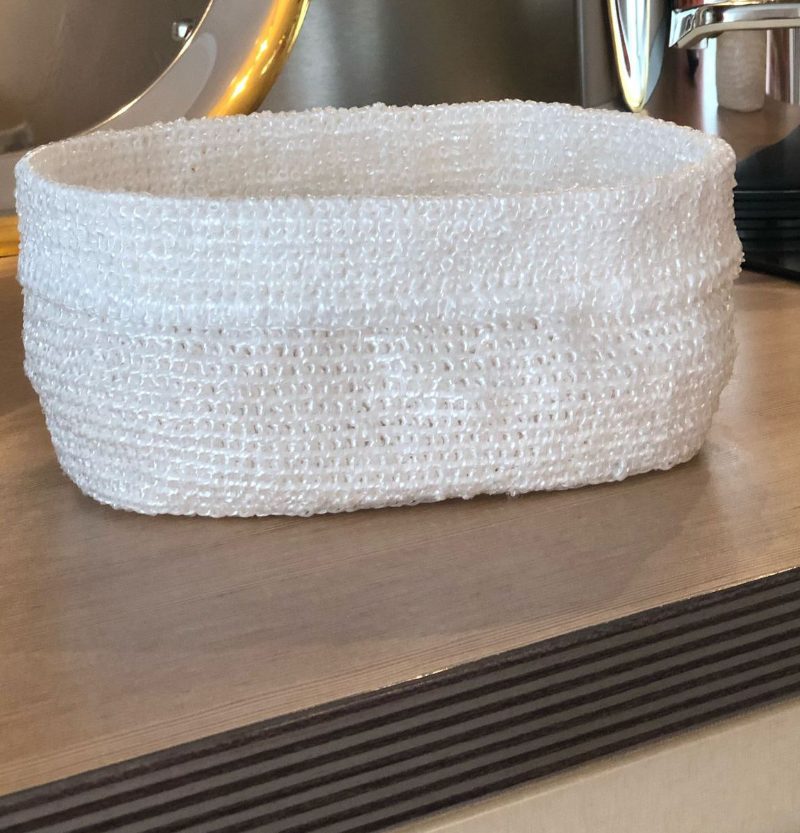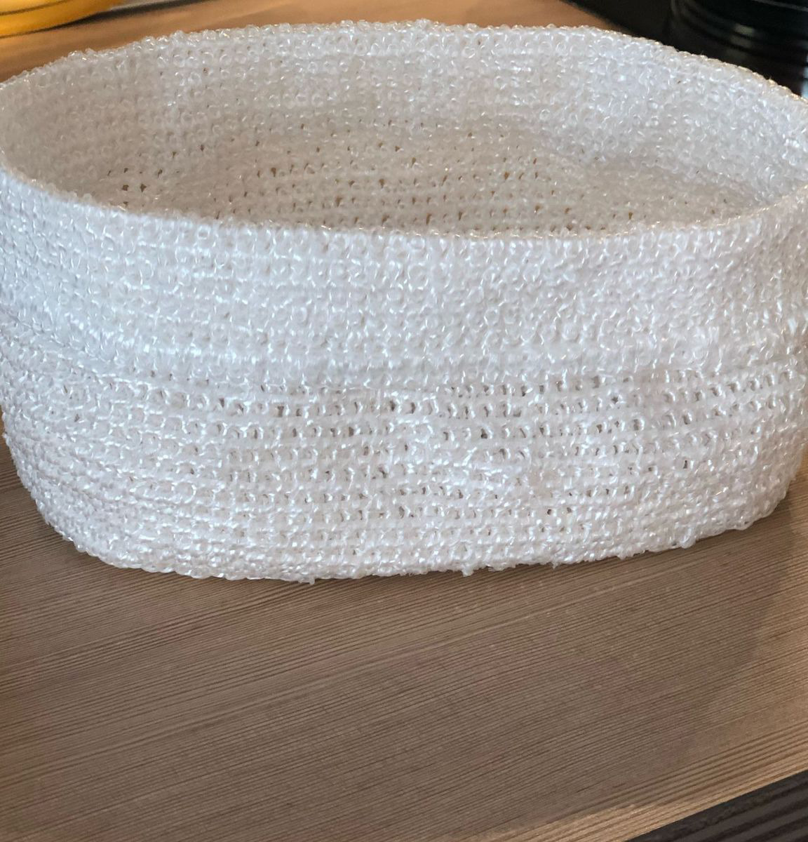 Вязаная корзиночка, контейнер для различных мелочей, кремов, средств по уходу, нижнего белья или носочков, из полипропиленовых ниток, держит форму, не боится воды, размер донышка 21х12 см, высота 13,5 см, можно стирать в стиральной машине