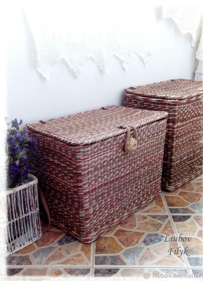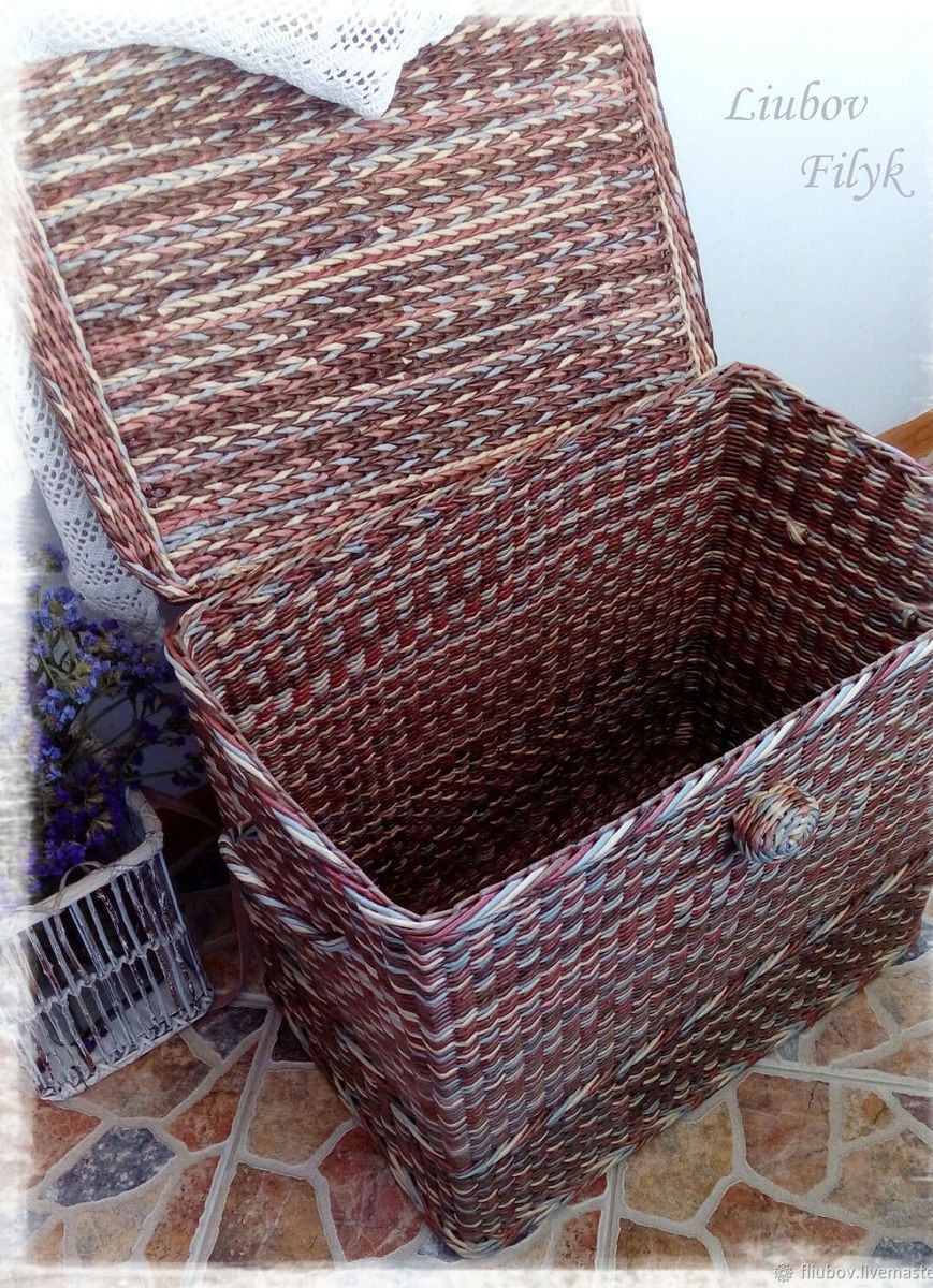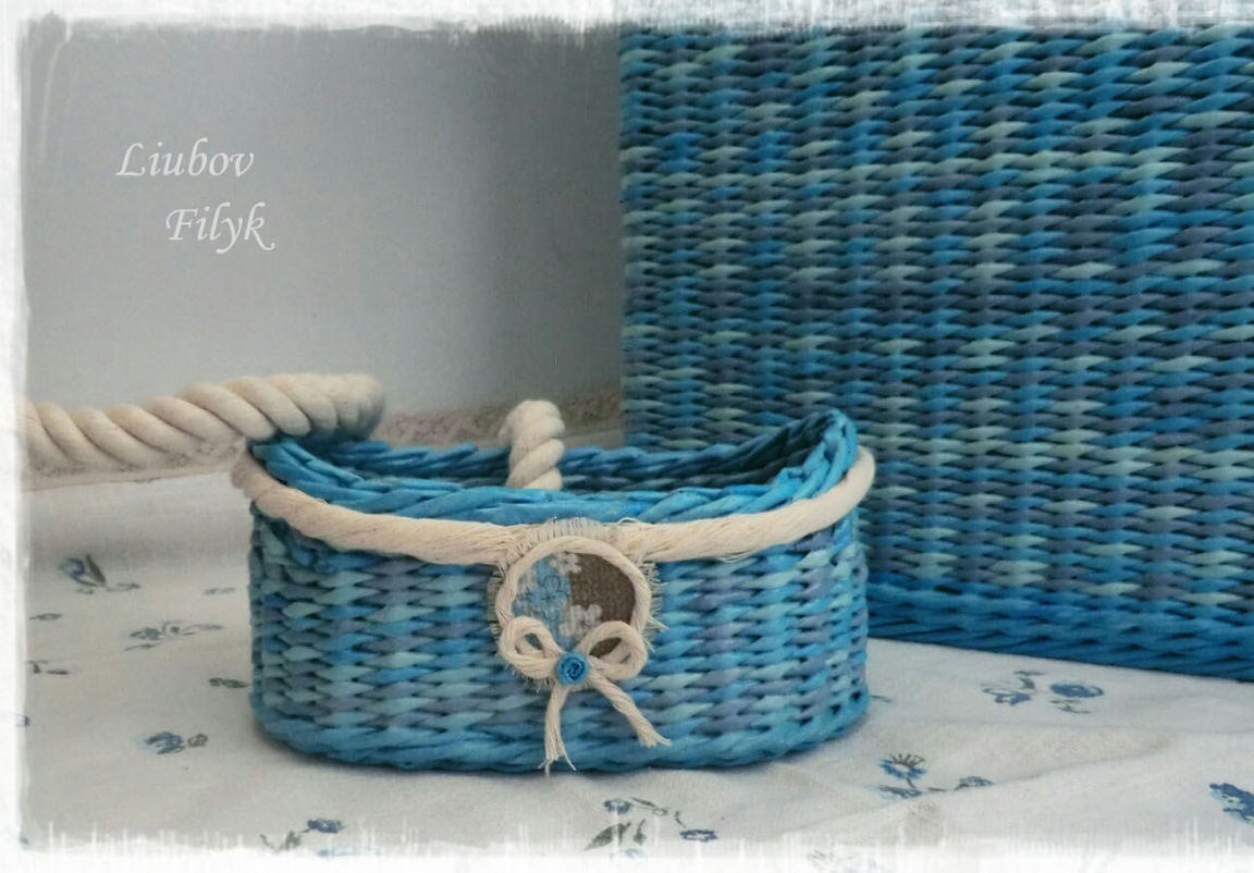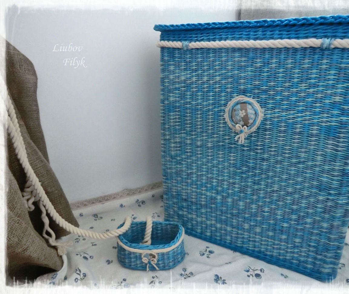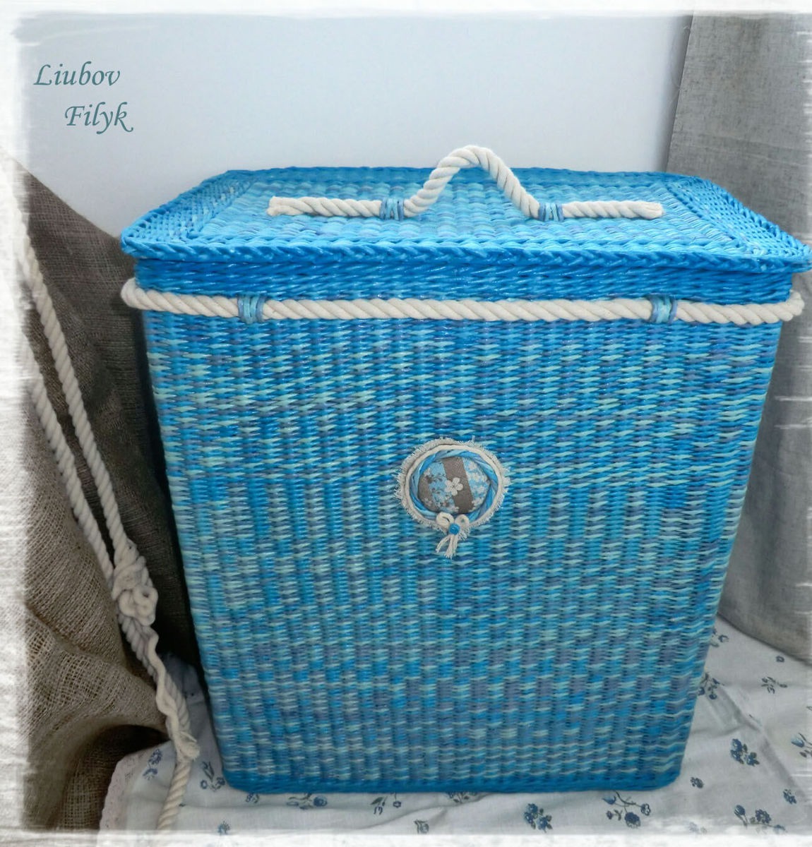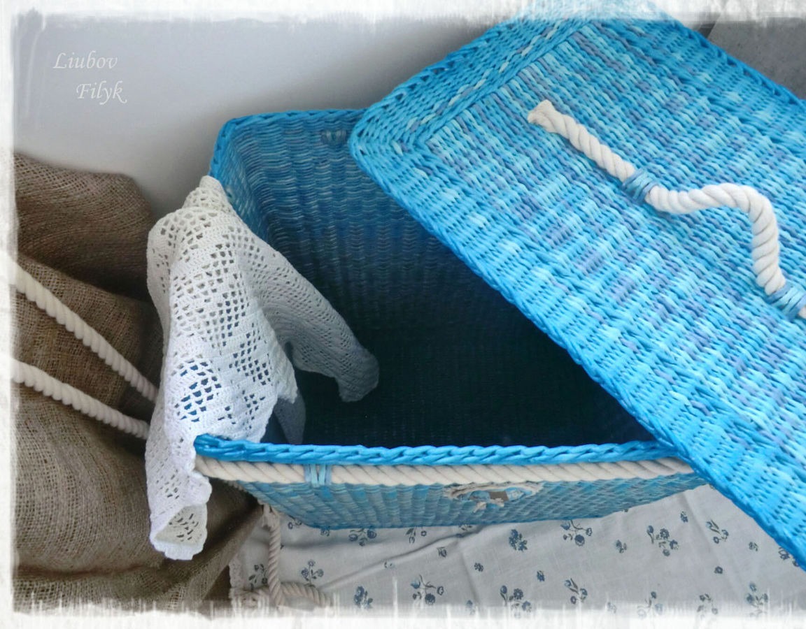 Корзина большая "Меланж..." полностью сплетена из бумажной лозы, прямоугольной формы. Достаточно прочная и вместительная. В ней можно хранить все, что пожелаете. Само название говорит о себе о сочетании цветов синего, мятного, серого. Стильный короб украшен бирочкой, как мягкой подушечкой,сделано декупаж на ткани. А также канатной веревкой, которая служит ручками. Крышка съемная Цена изделия зависит от размера.