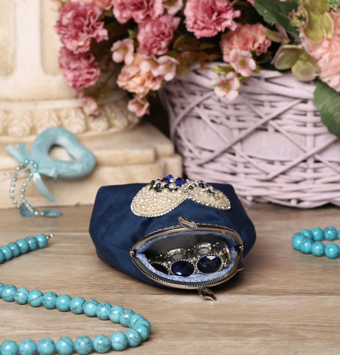 Бархат невероятно нежный, как прикосновение любимого человека. Яркое вышитое сердце в центре как символ страсти и огня! В вышивке использован серебряный чешский бисер, кристаллы и жемчуг. Жемчуг - символ долголетия и здоровья, богатства и счастья, помогает привлечь удачу. Такое сочетание отлично смотрится на темно синем бархате. Внутренняя часть монетницы на подкладке из натурального хлопка.