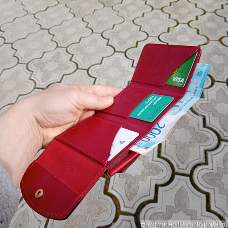 Внутри большой удобный отдел для купюр, три кармашка для карт "в каждый легко помещаются по несколько карт".