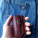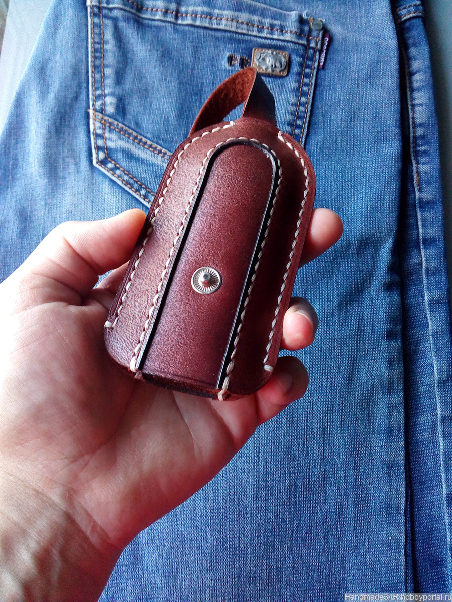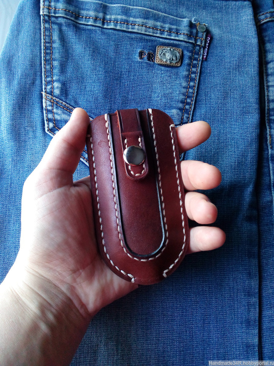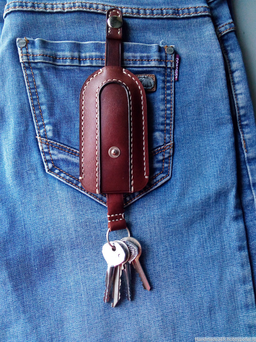 Ключница из натуральной кожи защитит карманы и вещи к примеру (телефон) в вашей сумке от царапин, которые могут оставлять металлические ключи. Пользоваться ей очень легко — просто расстегните кнопку и потрясите ключницу. Убрать ключи обратно внутрь также легко — потяните за ремешок и застегните кнопку! Такая ключница — это практичный и стильный подарок на любой случай! Ключница сделана из качественной натуральной кожи и прошита вручную седельным швом. Такой шов гораздо прочнее машинной строчки и ваша ключница будет радовать вас долгие годы. Ключница не плоская а имеет объём, который позволяет более комфортно помещать и извлекать ключи. На заказ можно изготовить другого цвета.