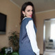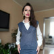 Костюм выполнен из полушерстяной нити джинсового цвета.