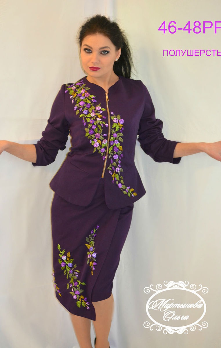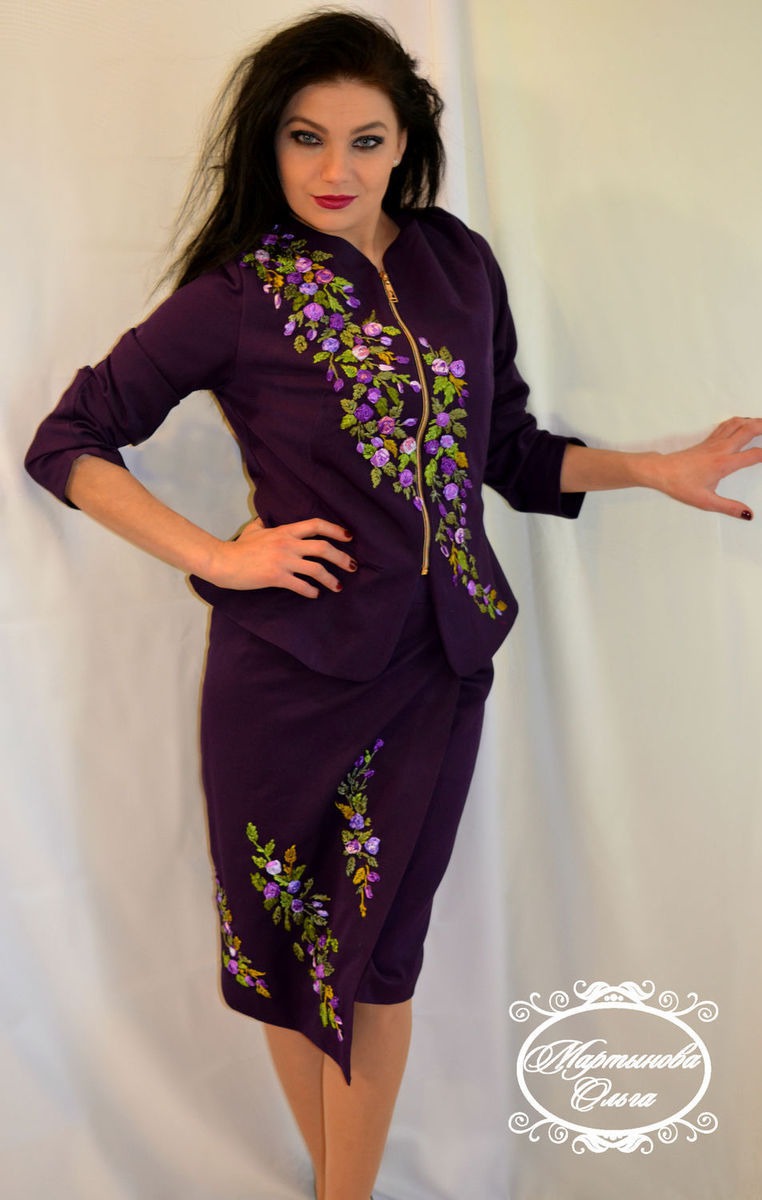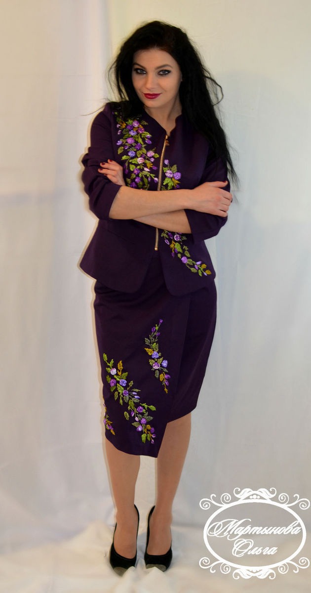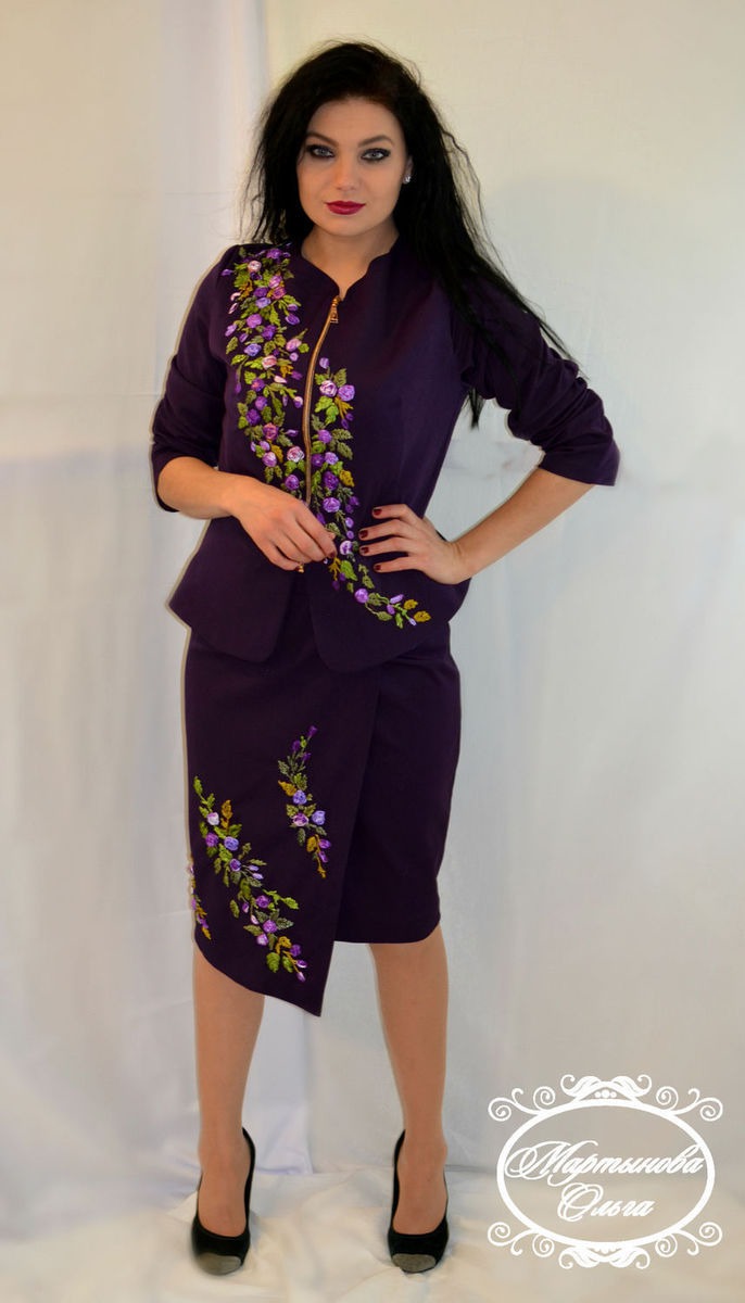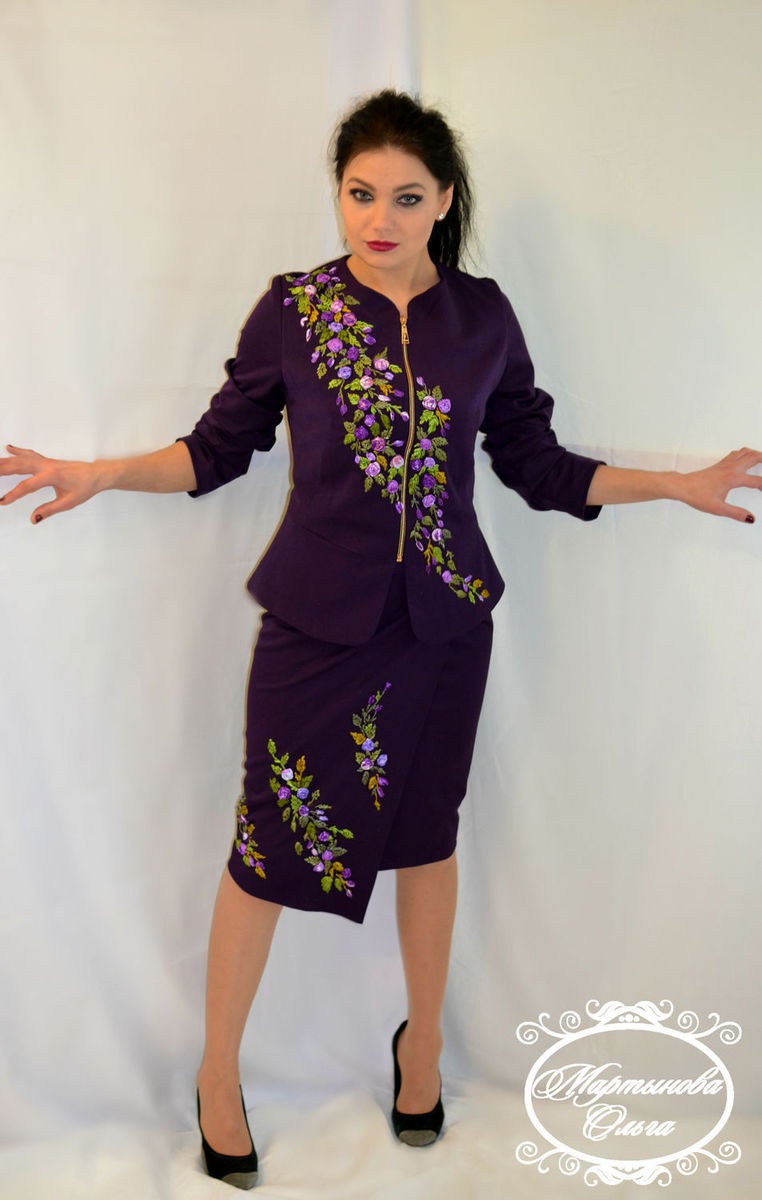 Эксклюзивный вышитый костюм чернильного цвета , изготовленный из полушерсти и подклада . Пиджак застегивается на молнию . Юбка с фигурной удлиненной полочкой что додает костюму загадочности Вышивка выполнена из атласных лент фиолетово сиреневых оттенков узором из мелких розочек и бутончиков Вышивка полностью ручной работы Очень красивое сочетание цвета ткани и вышивки, смотрится достаточно ярко, но без излишеств. Длина пиджака позволяет носить его отдельно от юбки с другой одеждой. возможен повтор из подобной ткани.