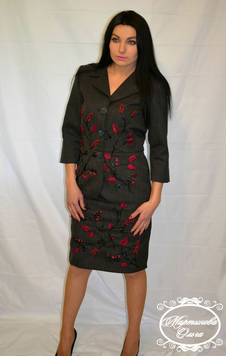 костюм из полушерсти темно серого цвета украшена вышивкой лентами авторская работа . идеально подходит как нарядная одежда так и для повседневной носки .в таком наряде вы будете чувствовать себя удобно и комфортно привлекая взгляды окружающих