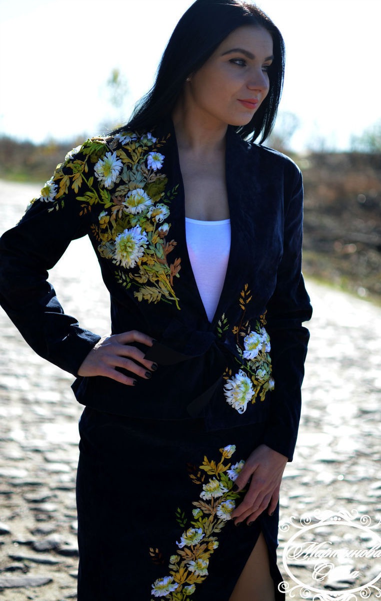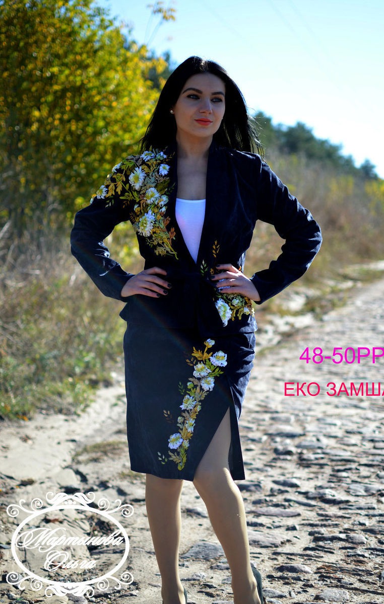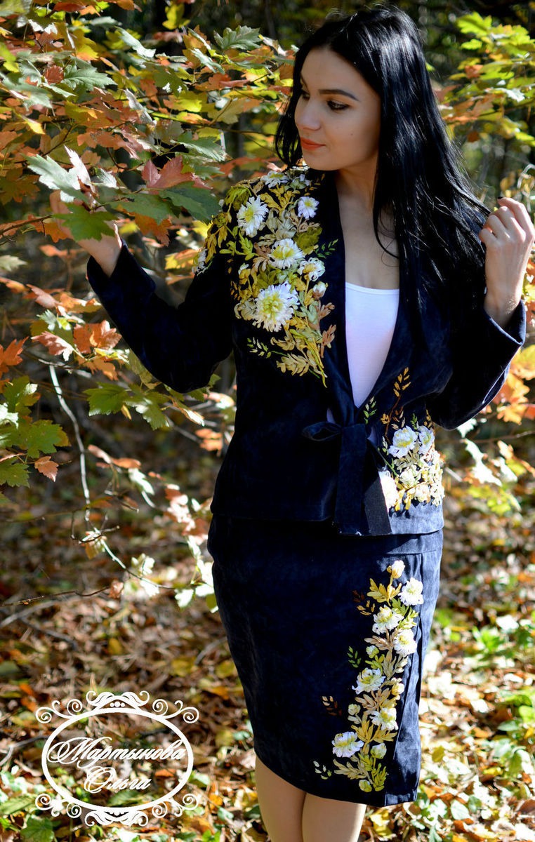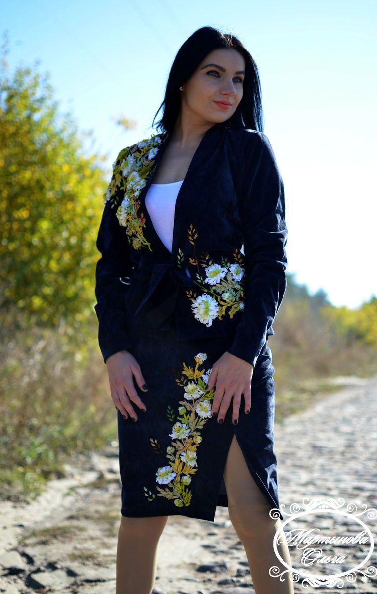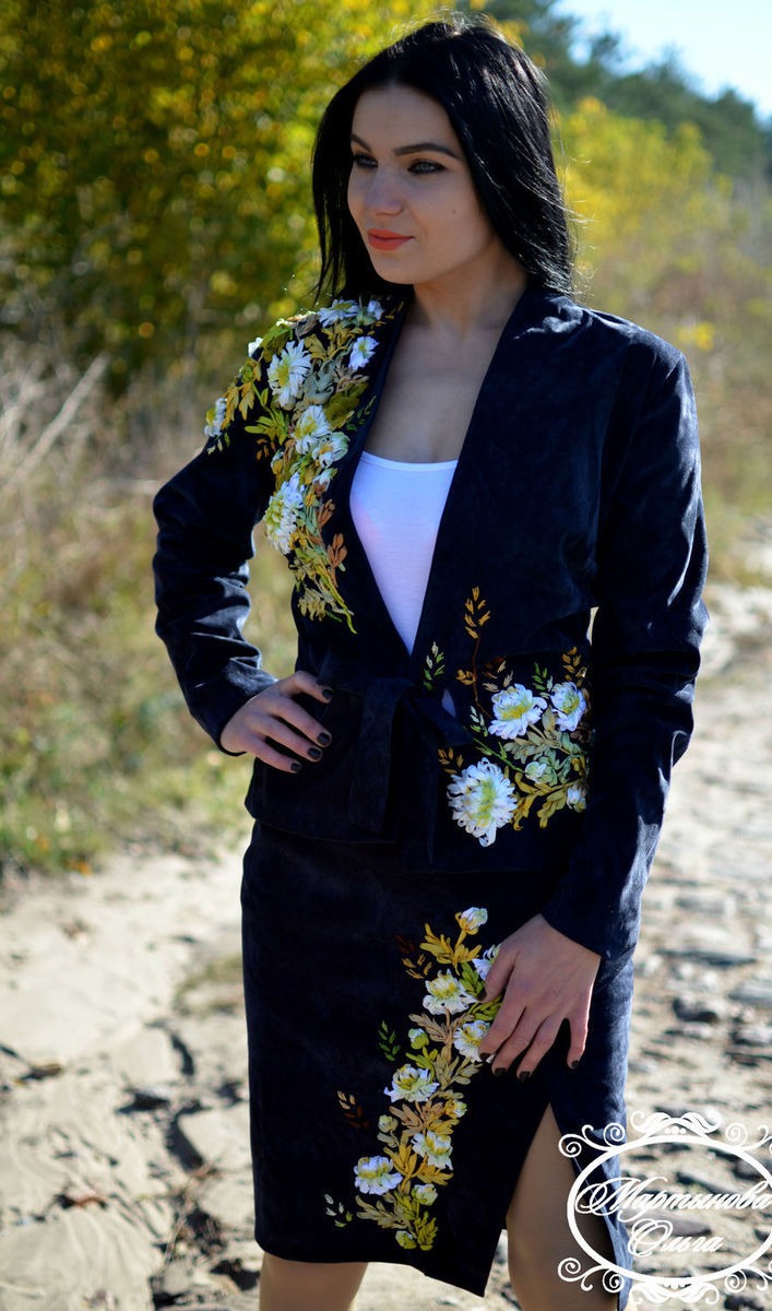 костюм из єко замши украшена вышивкой лентами авторская работа . идеально подходит как нарядная одежда так и для повседневной носки .в таком наряде вы будете чувствовать себя удобно и комфортно привлекая взгляды окружающих