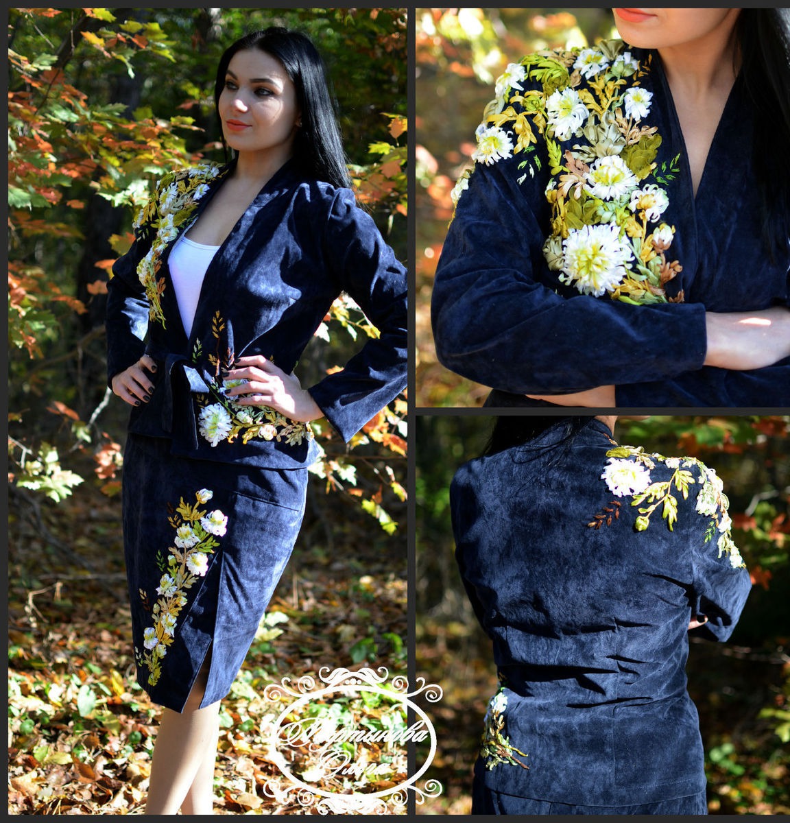 цветочный, авторская работа, вышивка лентами, вышивка, темно-синий, ручная авторская работа, ручная работа handmade, авторская ручная работа, ручная вышивка, вышивка ручная, костюм женский, вышивка на одежде