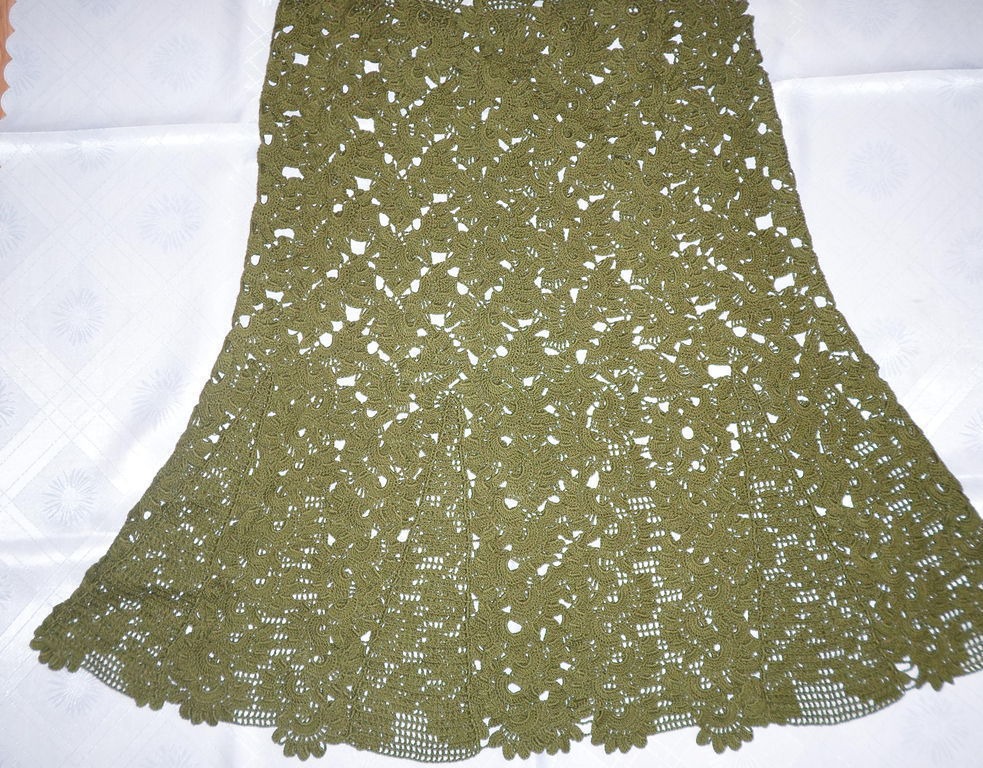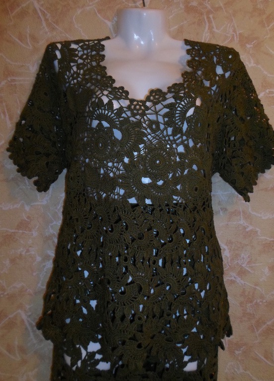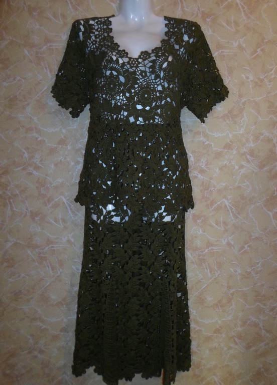 Ажурный нарядный костюм сделает Вас неотразимой. Костюм связан крючком в технике ирландского вязания и ленточного кружева.По поясу юбки ввязана резинка.Окружность груди по блузке 102 см, окружность бедер по юбке 110 см, длина блузки от плеча 60 см,длина рукава от плеча 33 см,длина юбки 81 см. Костюм слегка растягивается, поэтому подойдет на размер от 52 до 56