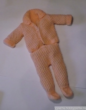 Комплект состоит из кофты и ползунков. Связан из детской акриловой пряжи.