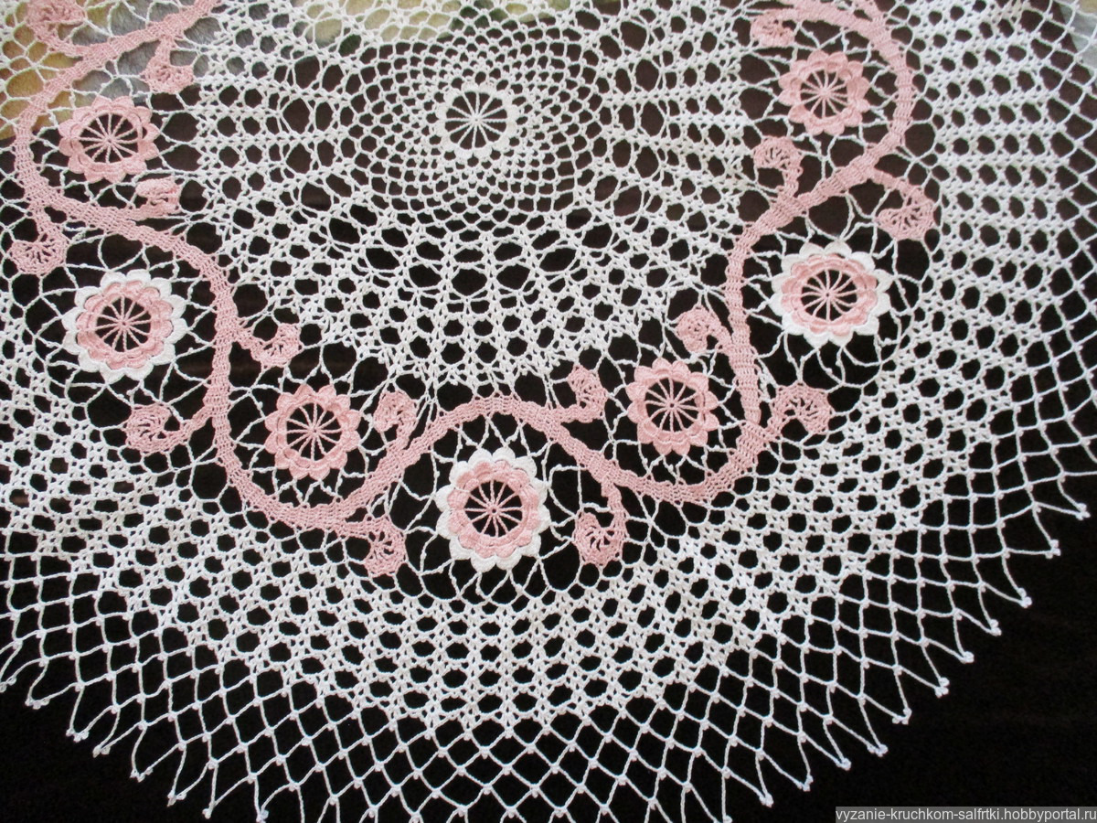 Очень красивая и нежная ажурная мини-скатерть на круглый стол с цветной полосой декора в технике брюггского кружева.