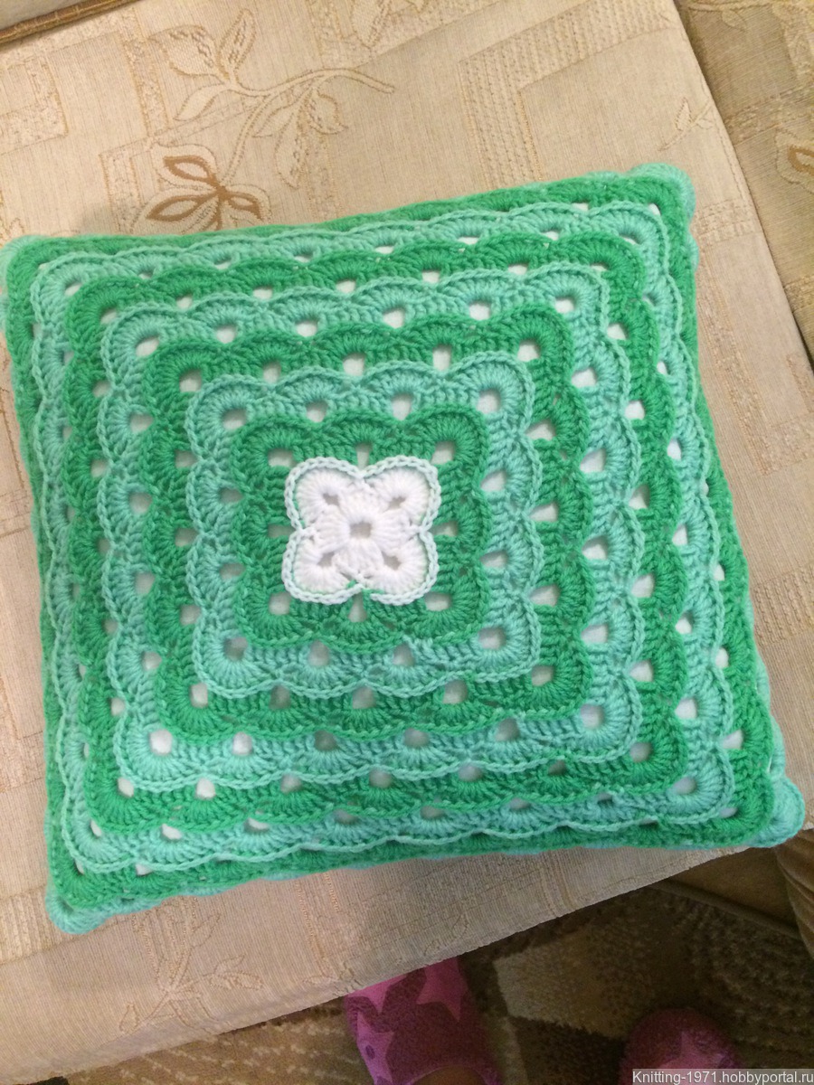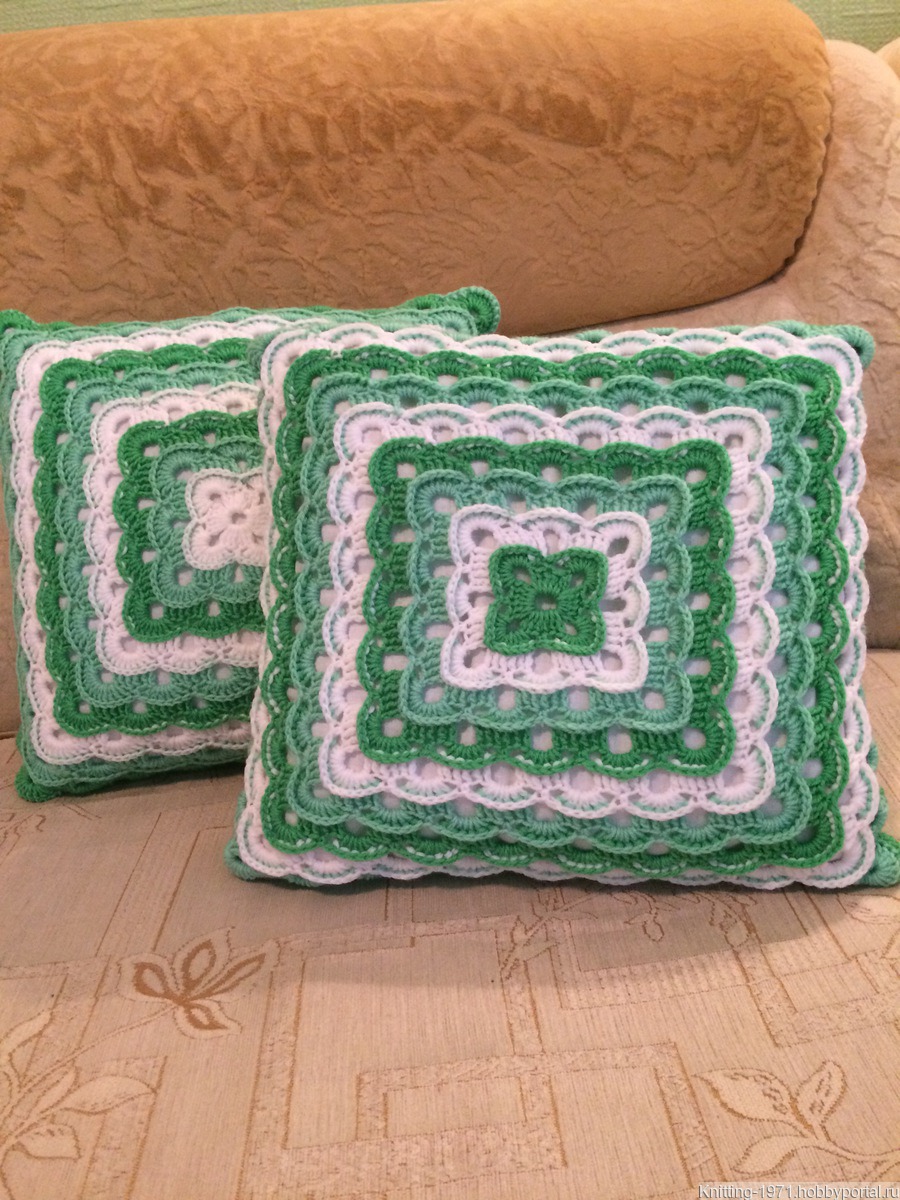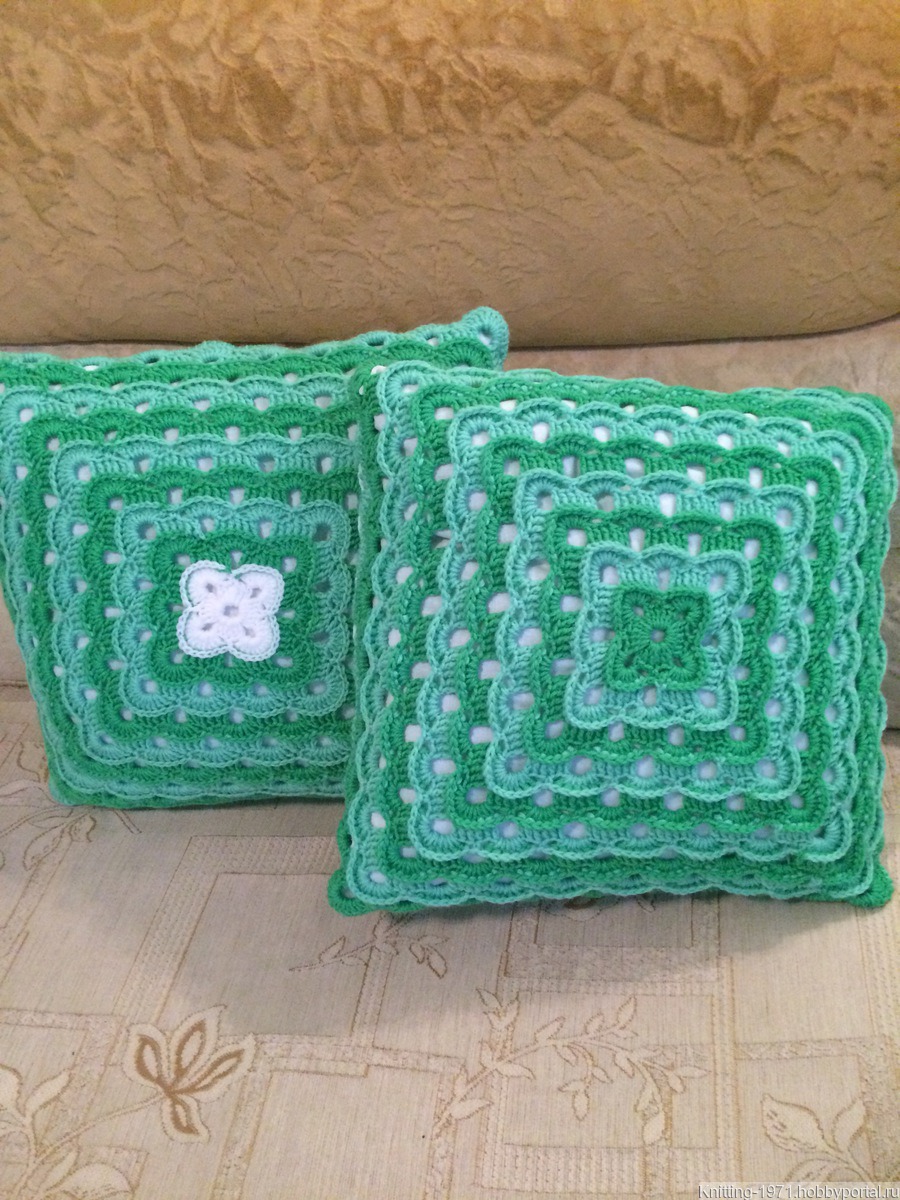 Декоративные подушки, связанные крючком из 100 % акрила. Наполнитель экологически чистый холофайбер, чехол 100 % хлопок. Выполнены в цветовой гамме :зеленый и белый.Размеры подушки 40 см на 40 см.