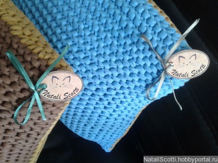 Декоративные двухцветные подушки. Крупная вязка из трикотажной пряжи. Внутри холлофайбер. Основной цвет - бежевый, дополнительные - голубой и коричневый.