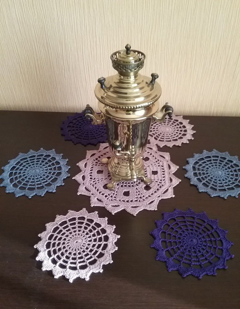 Симпатичные ажурные сервировочные салфеточки, составляющие комплект из одной большой салфетки и шести маленьких. Образец связан из хлопка. Диаметр большой салфетки - 21 см, маленьких - 14 см.