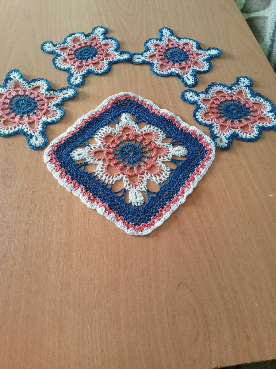 Салфетки связаны из мерсеризованного хлопка разного цвета. Размеры:большая-25х25см., маленькие-14,5х14,5