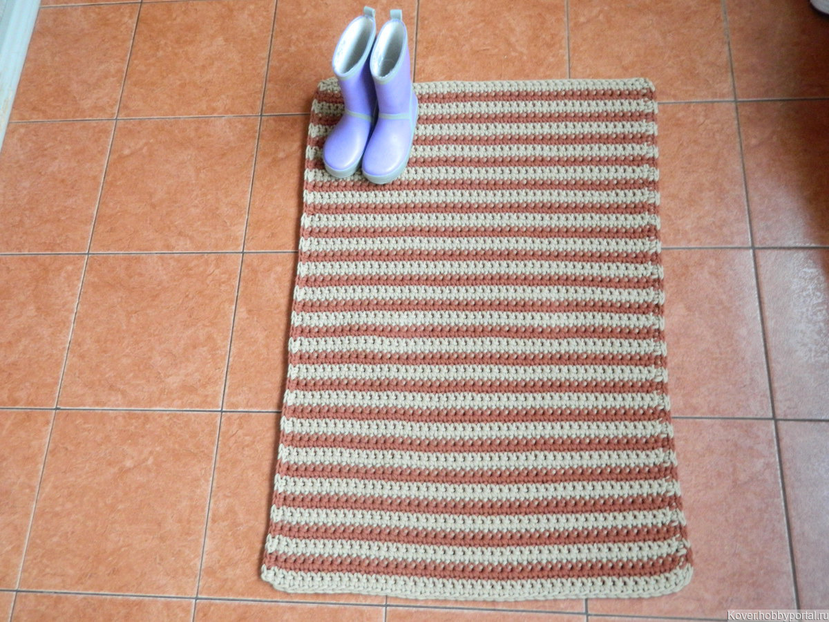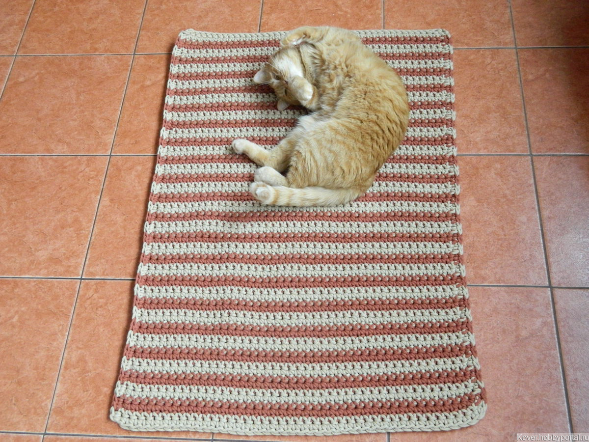 Связан из хлопкового шнура, диаметр 4 мм. Размер: 65х95 см. Цвета: "Песочный" и "Каштан". Классический и уютный полосатик!