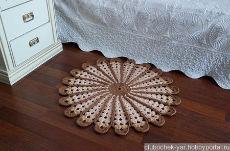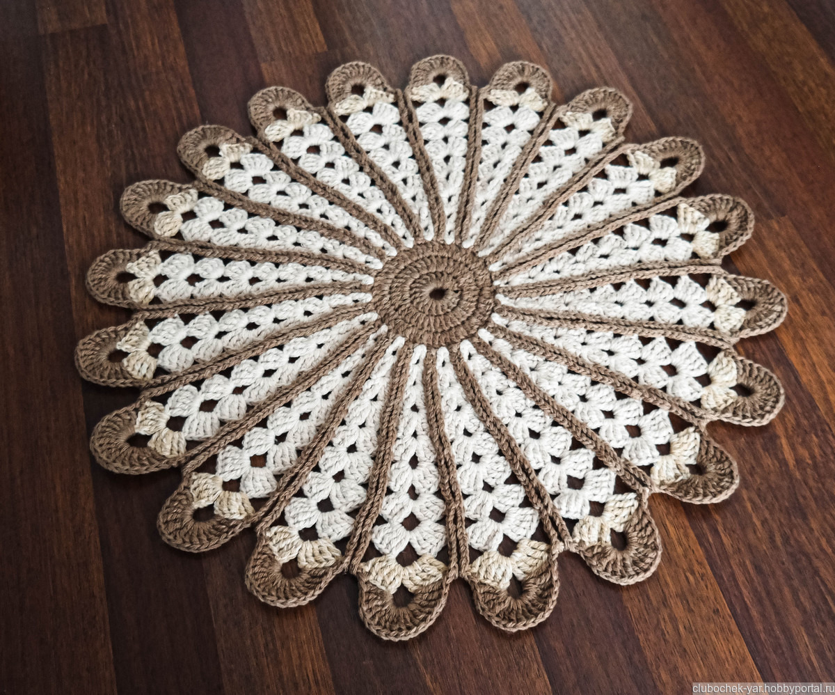 Коврик связан из акриловых ниток. Гипоаллергенный, мягкий, теплый, прост в уходе. В диаметре 85 см.