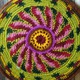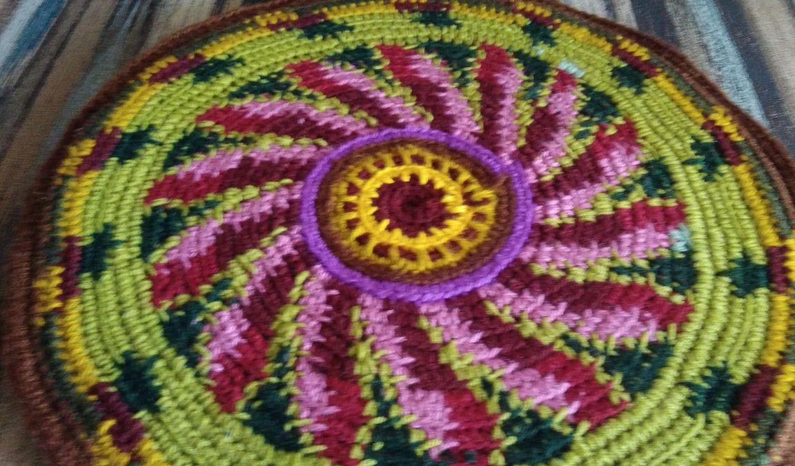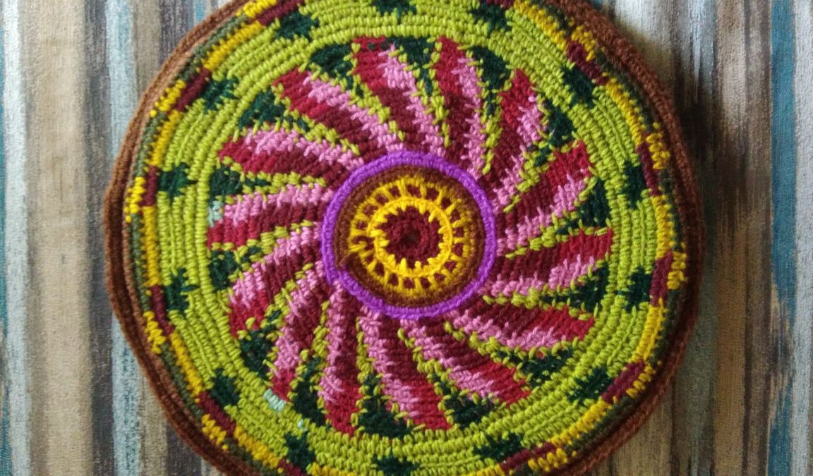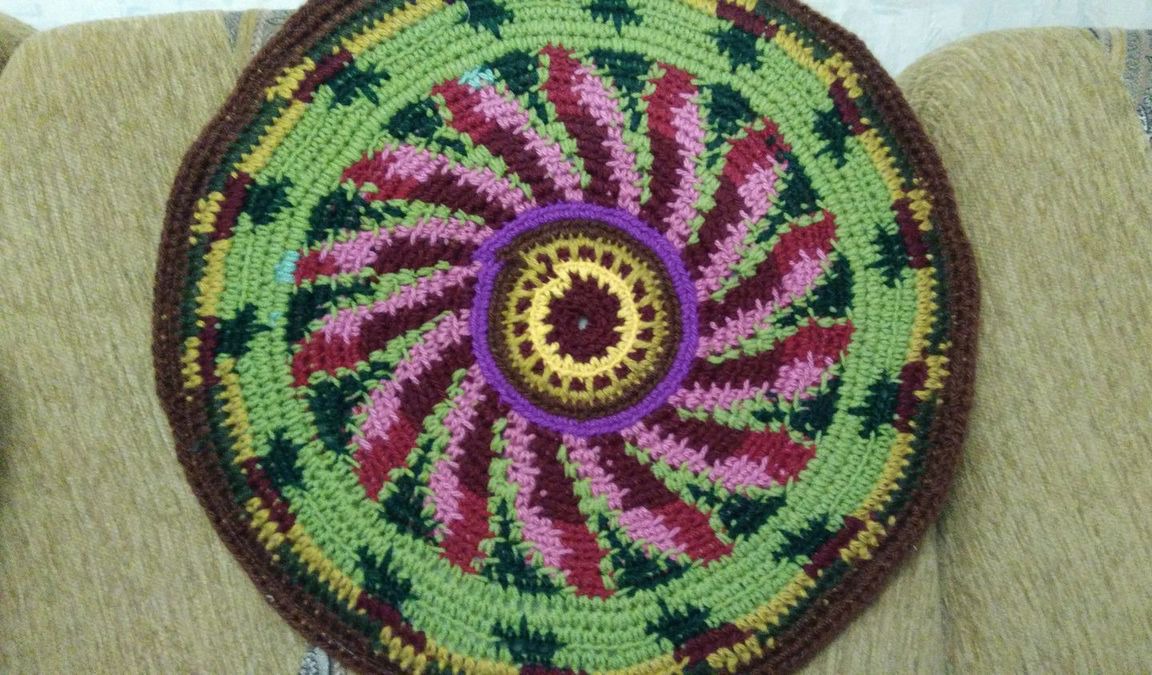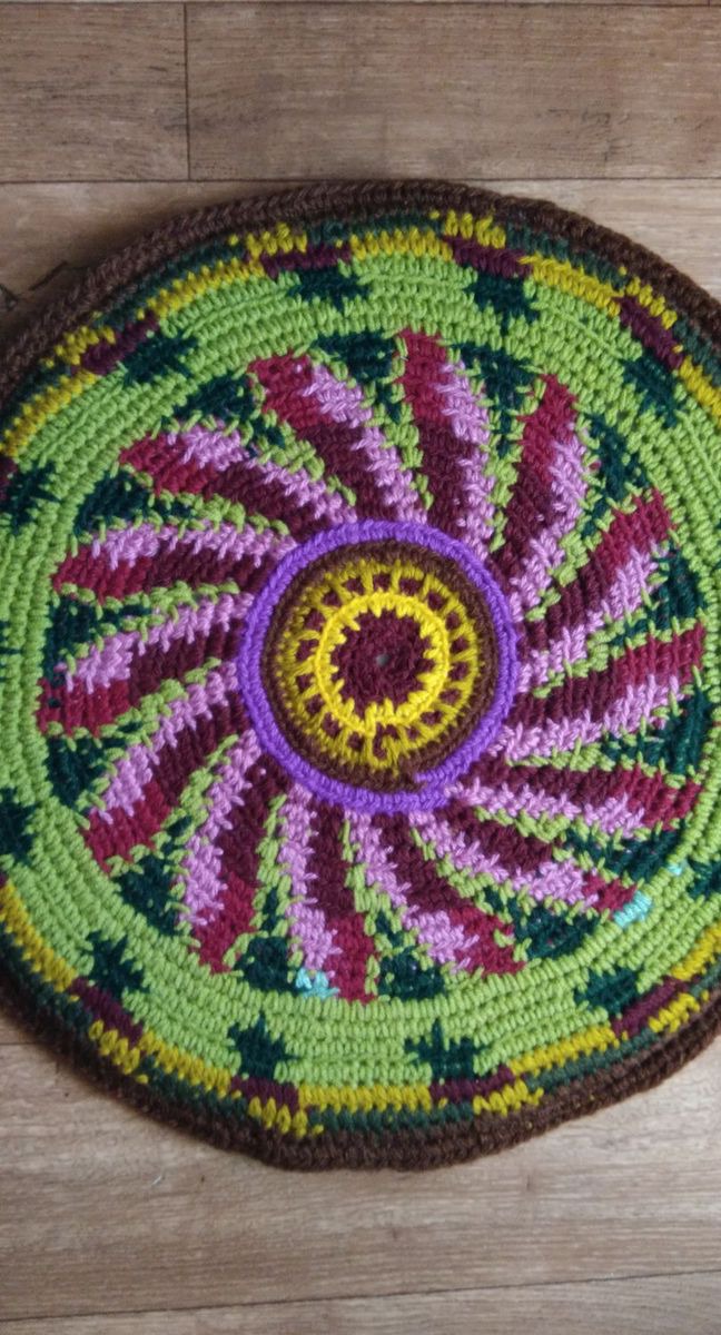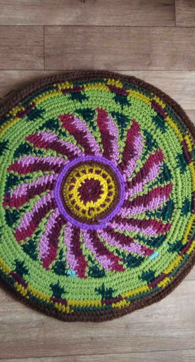 Коврик вязаный крючком из цветной полушерстяной пряжи, двусторонний. Нижняя сторона - флис. Внутри тонкий поролон. Коврик удобен для прогулок на природе. На нем тепло и мягко сидеть на лавочке, на скамейке. Можно украсить ним салон автомобиля или компьютерное кресло. Может быть самостоятельным элементом интерьера, создаст весеннее настроение и уют в доме.