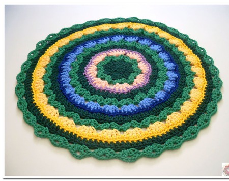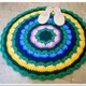 Разноцветный круглый коврик "Весенний" связан из прочного полиэфирного шнура с сердечником в ярких тонах с чередованием сочных оттенков зеленого, розового, синего и желтых цветов.