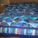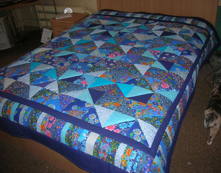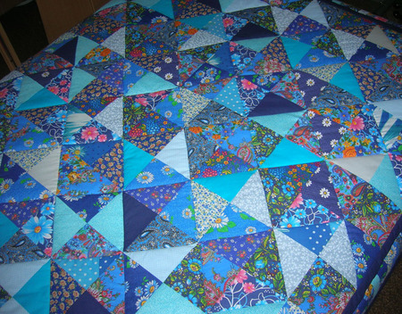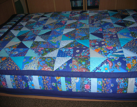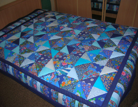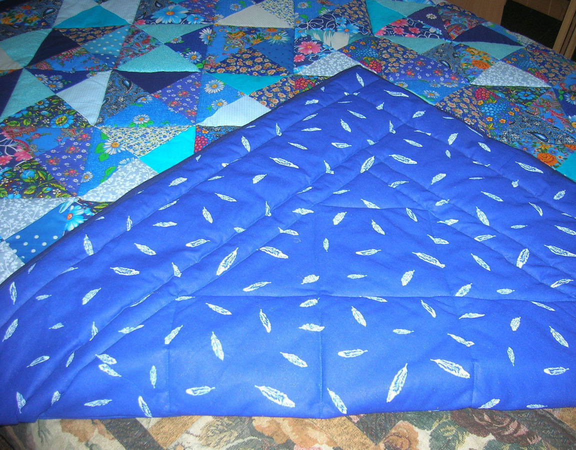 голубой, синий, подарок, подарок на любой случай, деревенский стиль, лоскутное одеяло, лоскутное покрывало, из лоскутов, на кровать, интерьер спальни, на дачу, на печку, спальня, треугольники, одеяло из треугольников, лоскуты, котедж, поджарок женщине