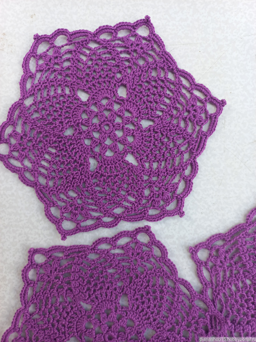 Ажурная салфетка связана вручную из 100% хлопка. Набор из 3 шт, размер 12 см в диаметре.