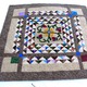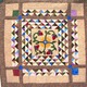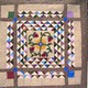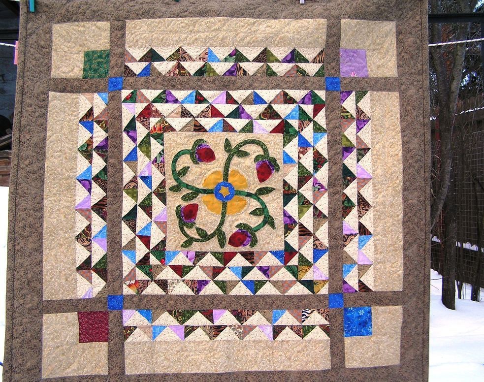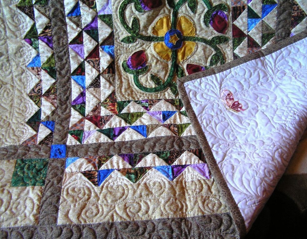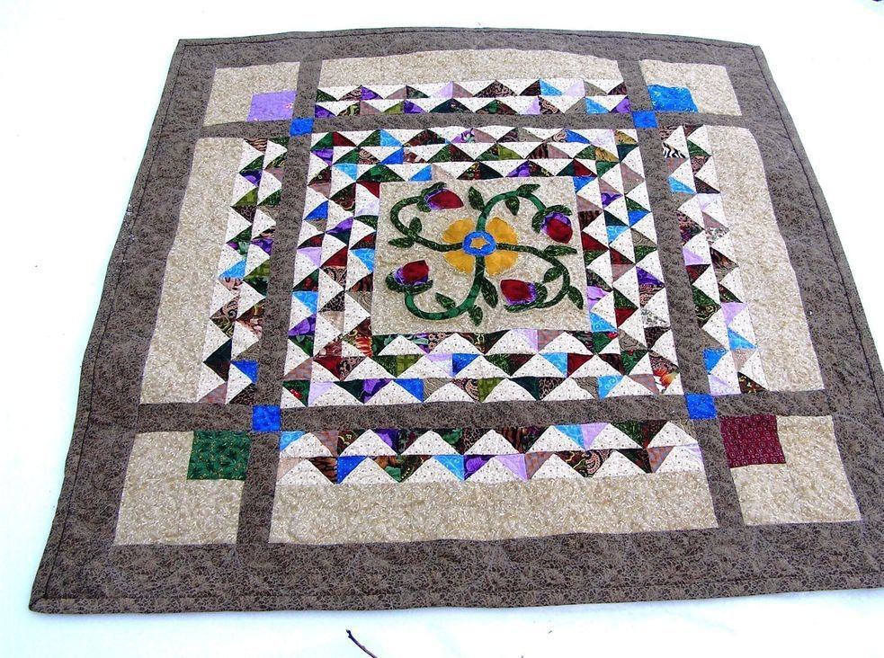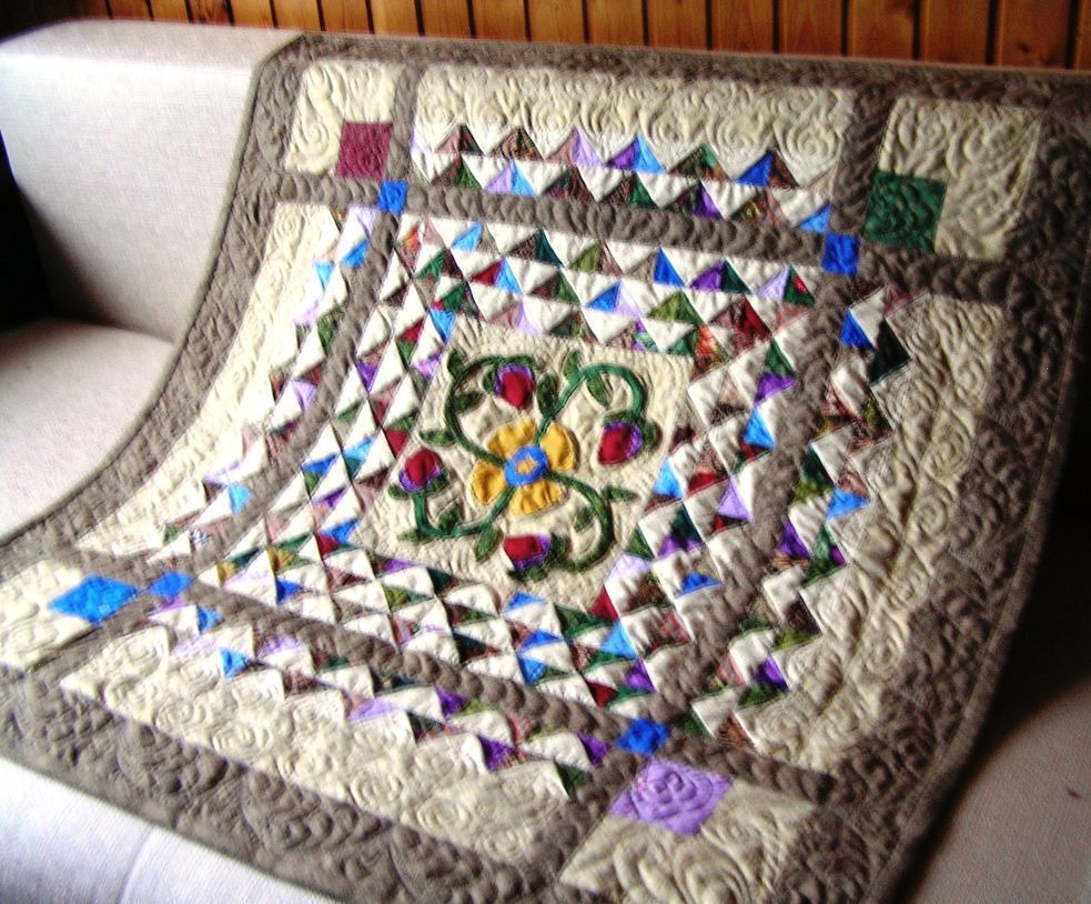 Центр лоскутной композиции - аппликация на фоне ткани с золотым тиснением, из этой же золотистой ткани - широкий бордюр. Разноцветные яркие лоскуты - как драгоценные самоцветы в золотой оправе.