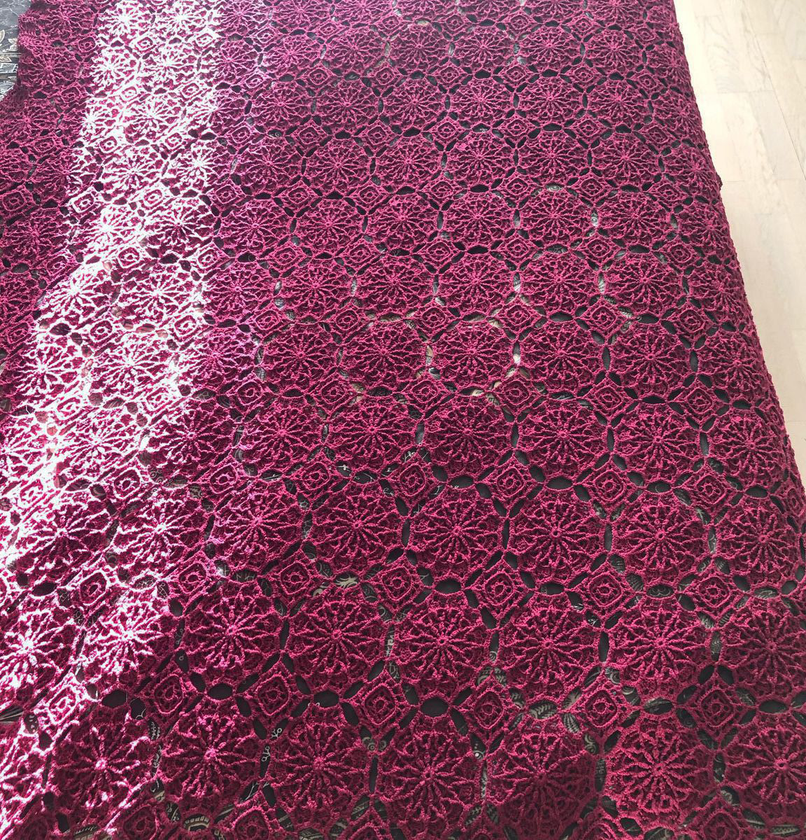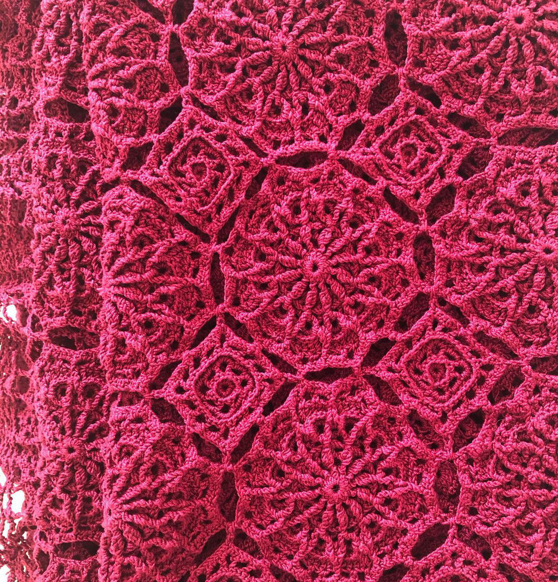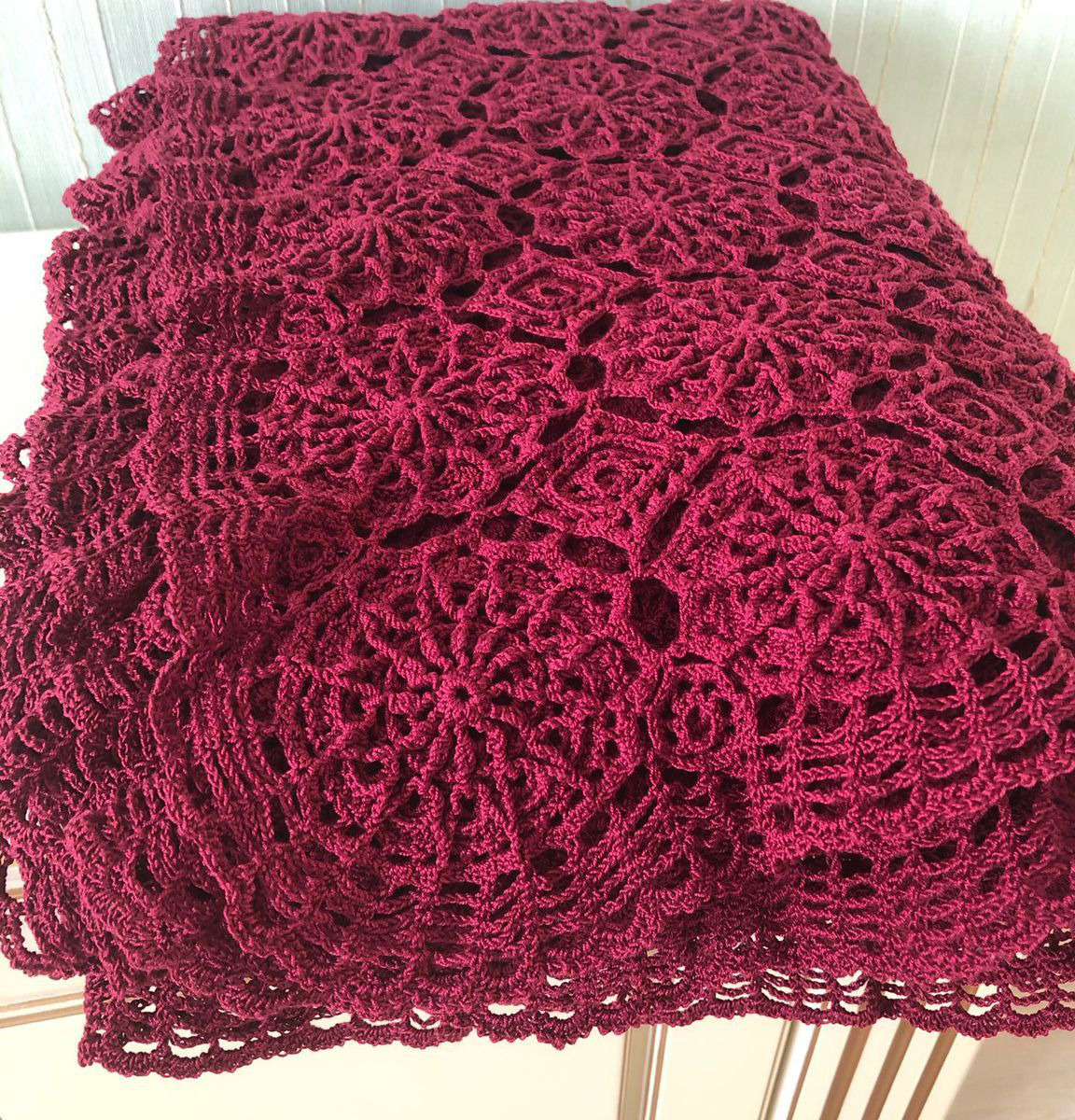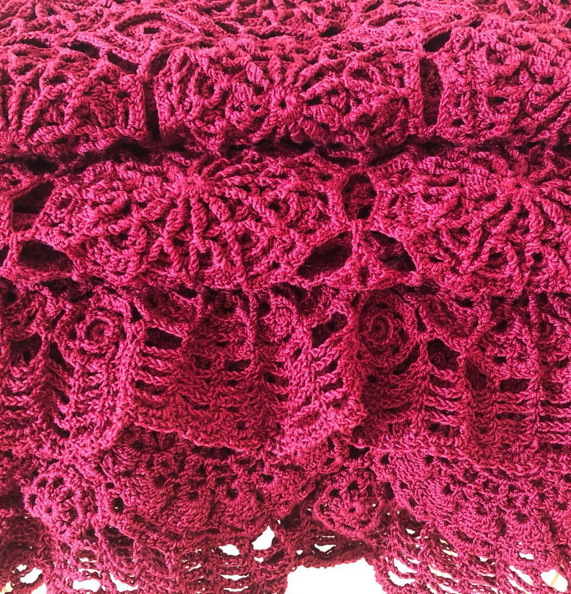 Легкий, воздушный плед связан крючком из хлопковой мерсеризированной пряжи бордового цвета