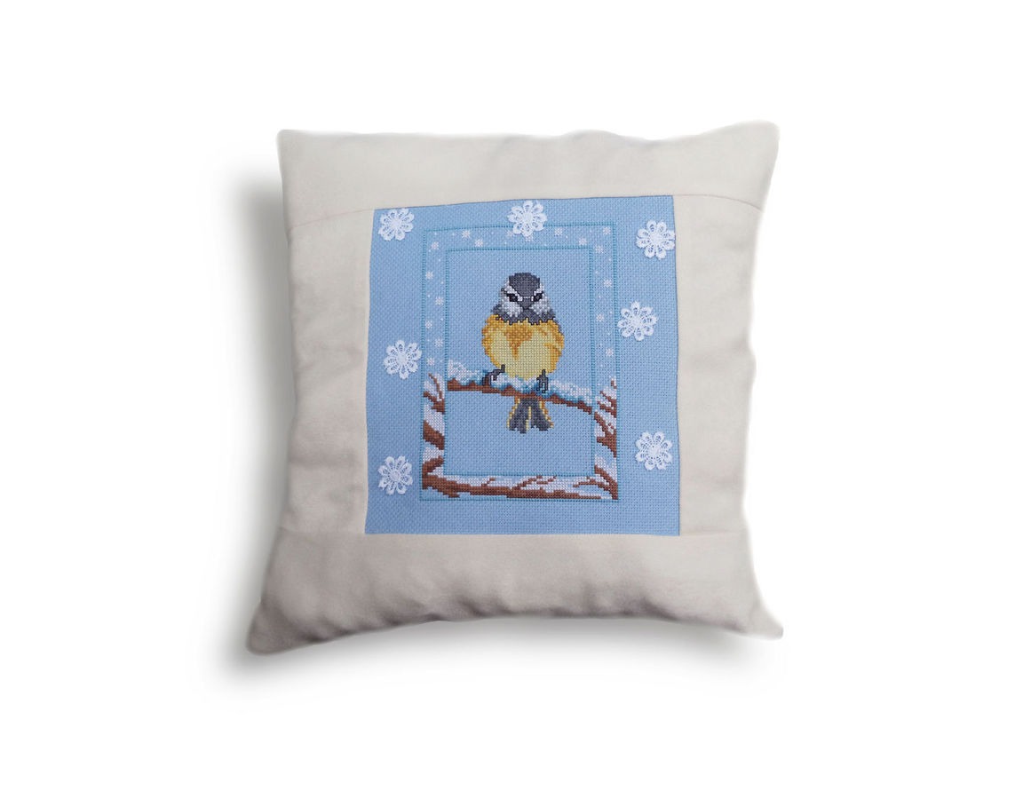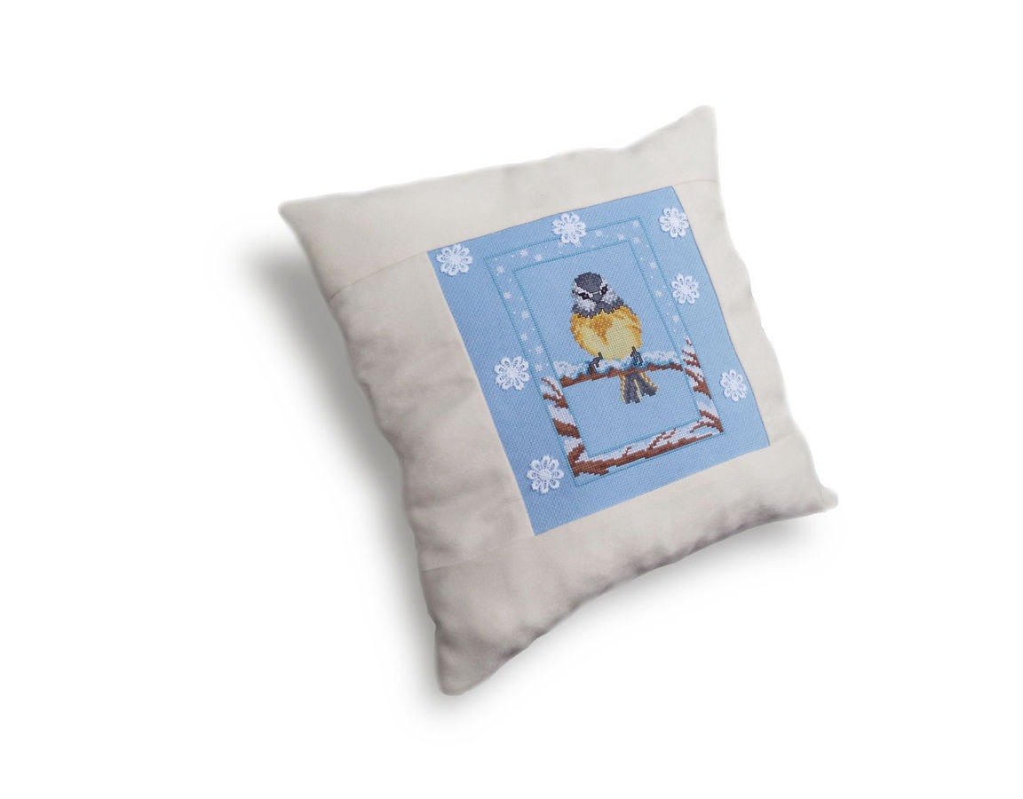 Когда я вышивала эту подушку за окном уже кружился первый снег, а на кормушке за окном обедали синички. Интерьерная подушка в любое время года будет напоминать о волшебстве зимы .