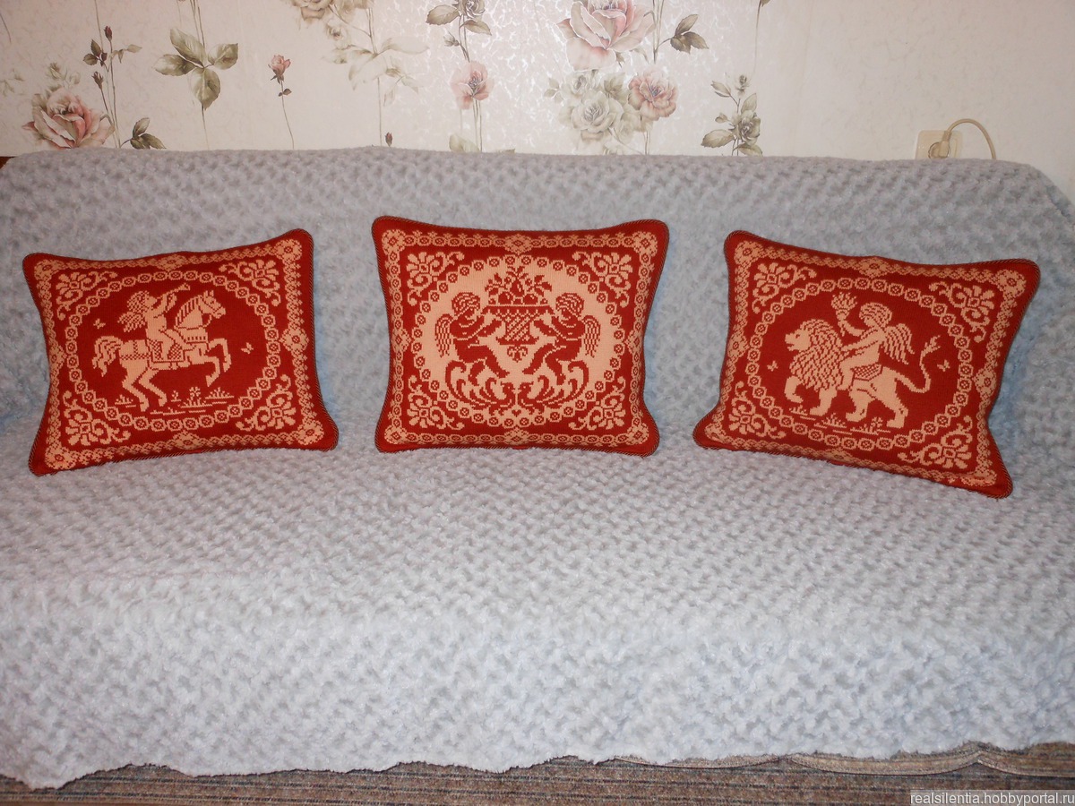 Комплект из 3-х вязаных подушек-думочек с ангелочками (50х40 см). Лицевая сторона связана на спицах из полушерсти 2х цветов(кирпичный и персиковый цвет). Схемы вязания авторские, всё сделано вручную и в единственном экземпляре.