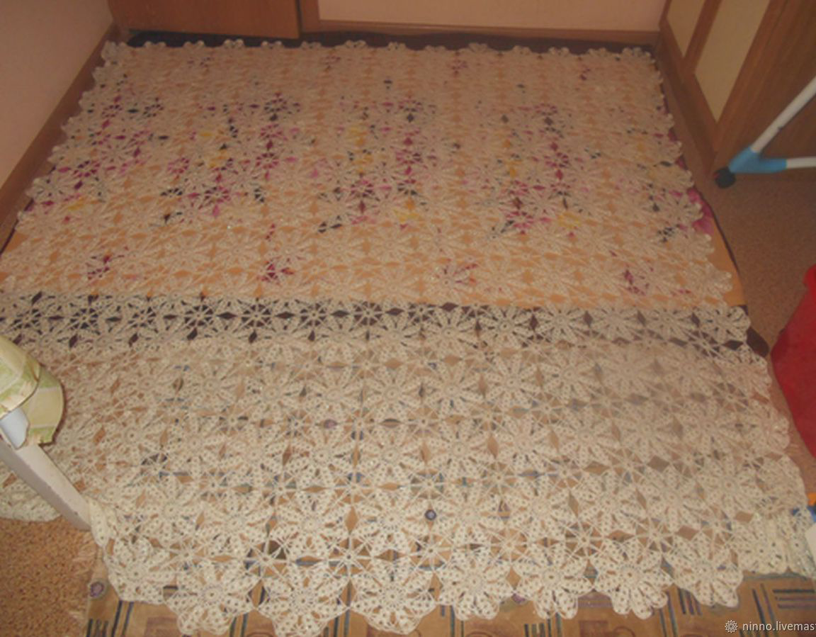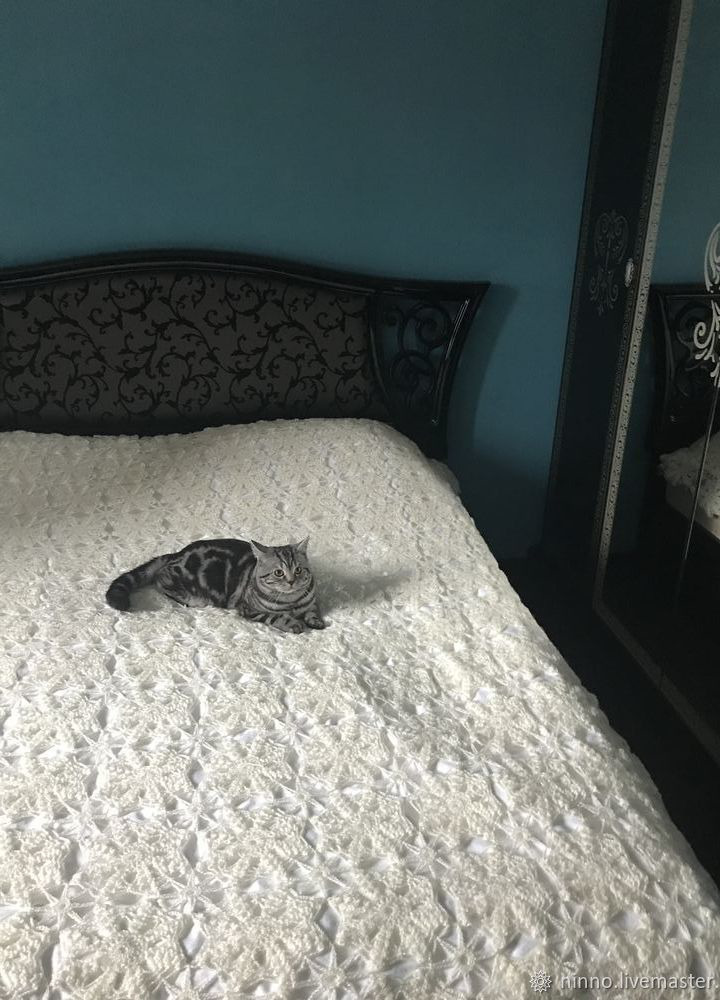 Покрывало выполнено на заказ крючком.Из пряжи Ализе ангора голд симли.На ощупь мягкое и воздушное.Поблескивает на свету из-за люрекса в пряжи.Полотно легкое и ажурное, собрано из отдельных мотивов.Первое фото уже у хозяйки.