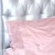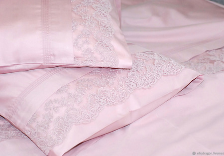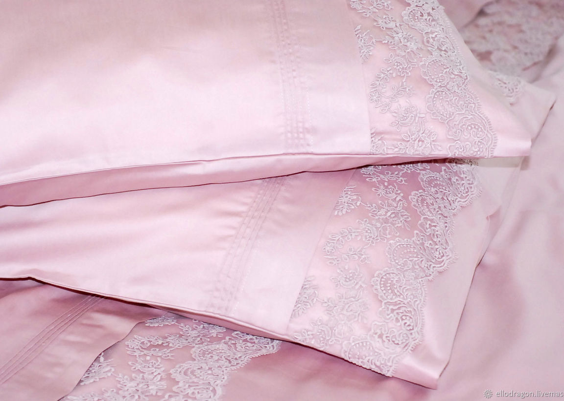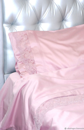 Постельное белье из сатина высшего качества цвета пудры с нежным золотистым отливом декорировано кружевом компании Blumarine.