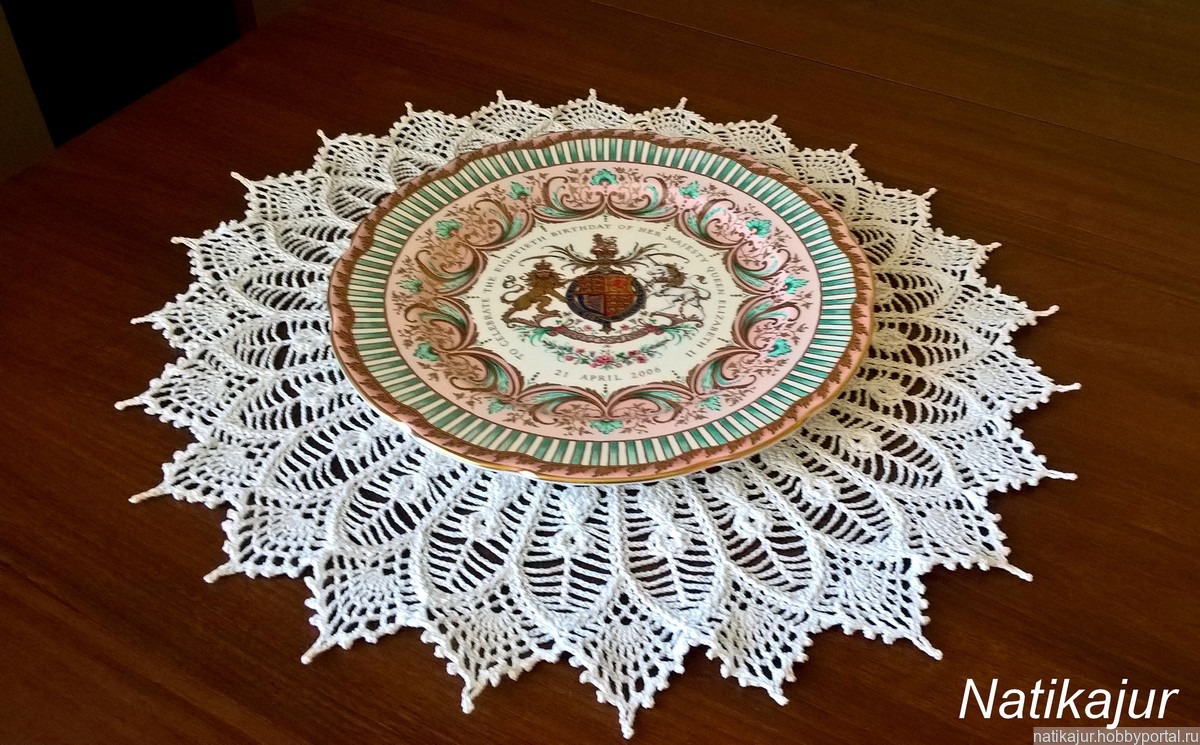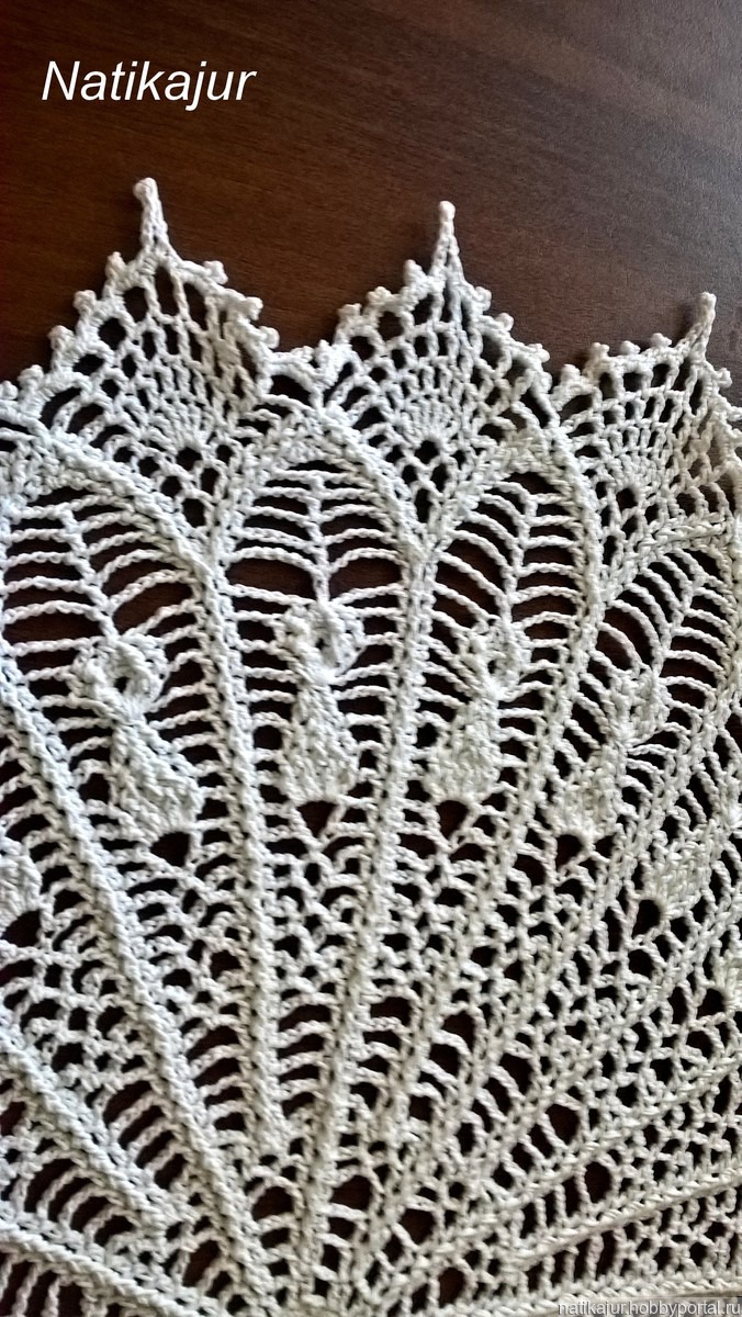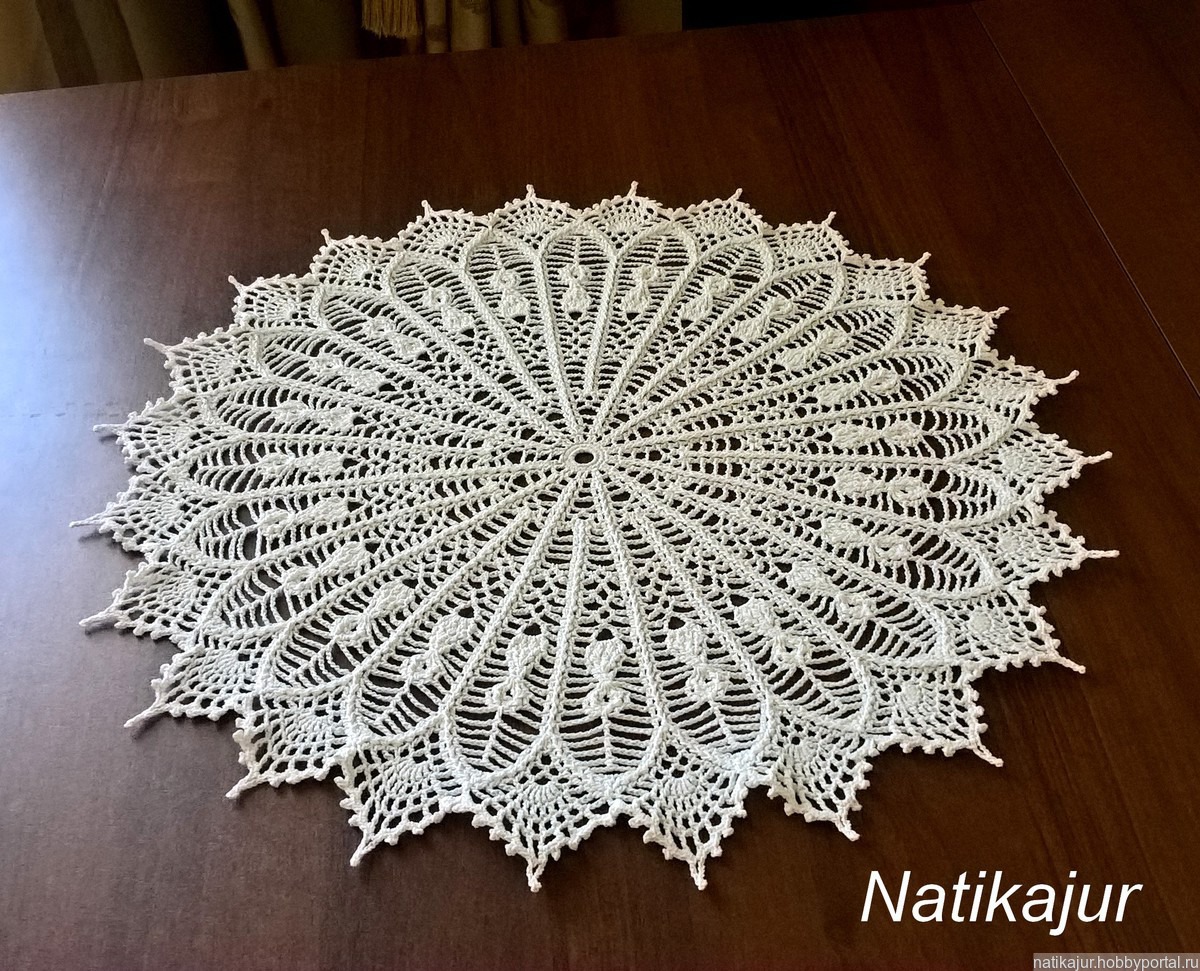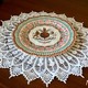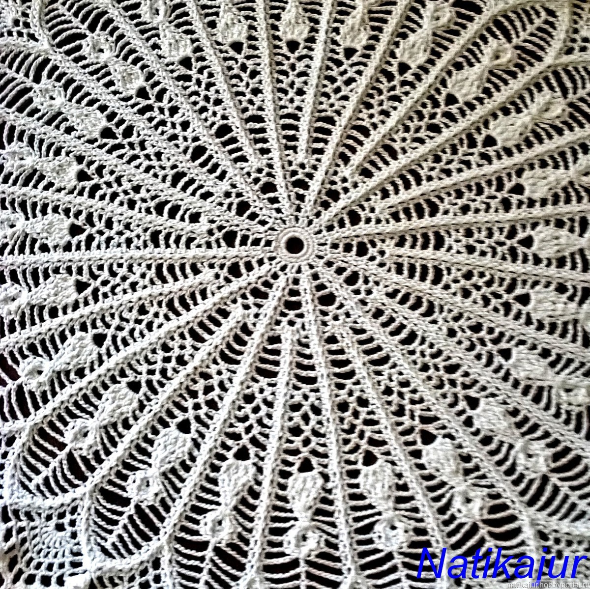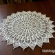 Большая салфетка круглой формы,связанная из 100% не мерсеризованного хлопка орнаментально относит нас к сложившемуся после 20-х годов 18 века во Франции стилю готической архитектуры - "лучистой" готике - типичному для того времени орнаменту в виде солнечных лучей, украшавших окна-розы, богатый и изящный ажурный узор которых очень декоративен, линии-"лучи", исходящие от центра, строги и упорядочены, а мотивы рождаются один из другого, подчиняясь направлению главных "лучей", вызывая в воображении ассоциации с окнами-розетками готических соборов разных городов мира.