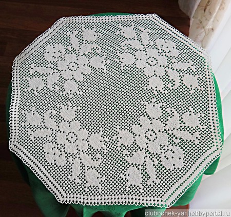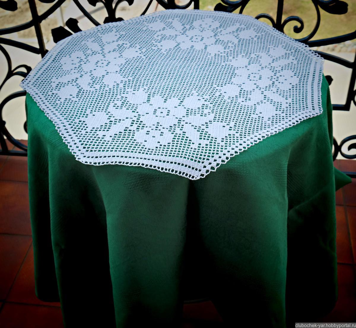 Салфетка связана крючком в технике филейного кружева из х/б ниток "Лилия". Имеет шестиугольную форму, размер 60x60 см.Станет прекрасным украшением Вашего дома, а также оригинальным подарком для друзей и близких. Размер 60 X 60 см