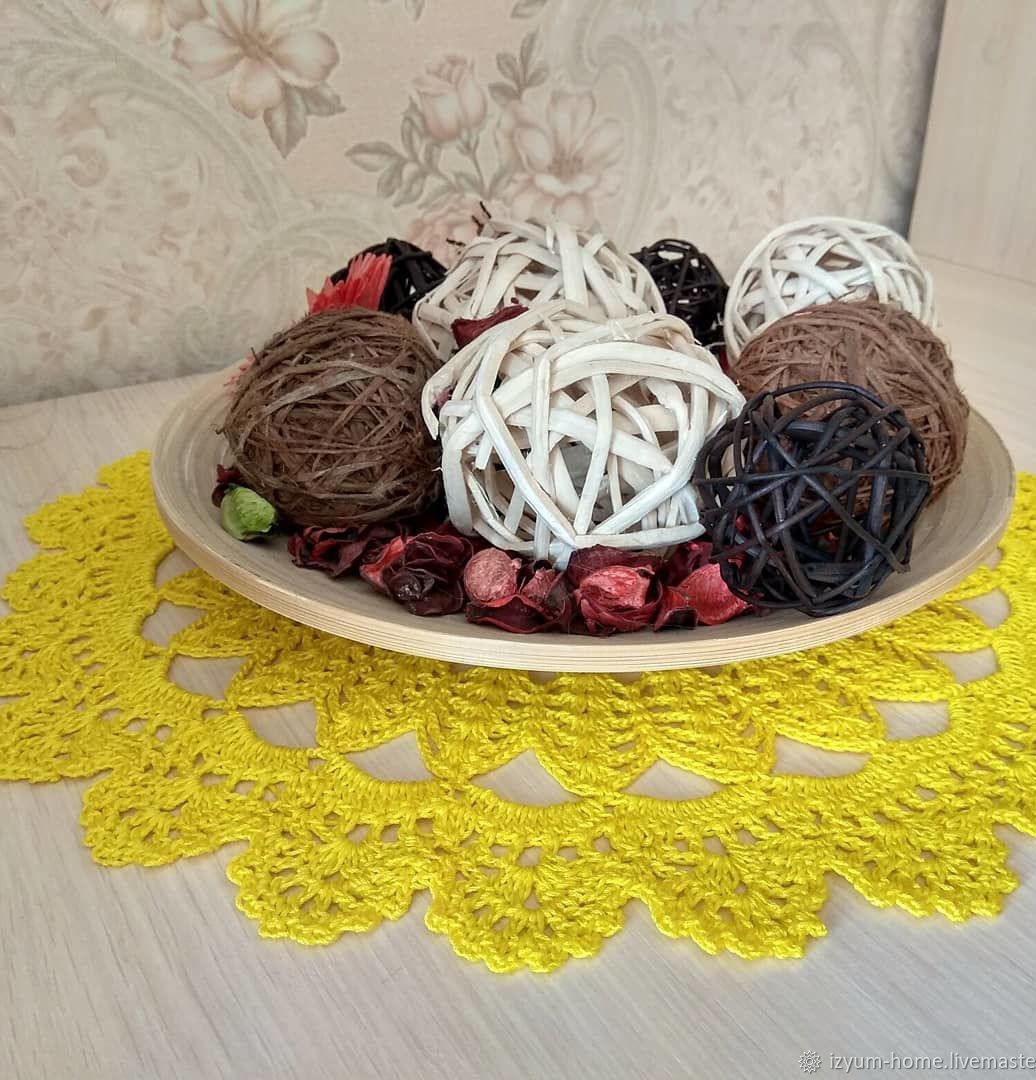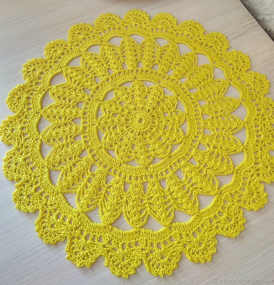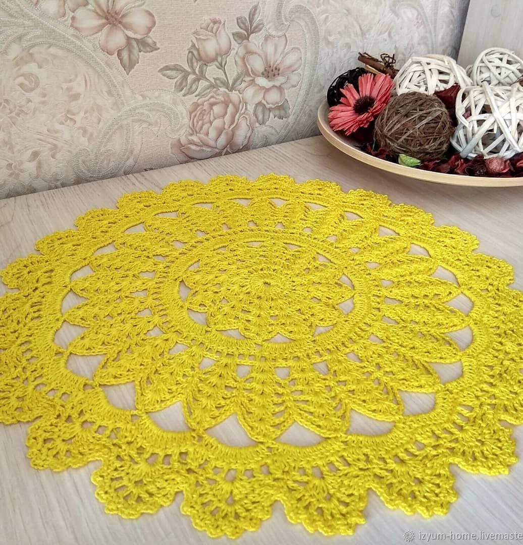 Такая ажурная салфетка цвета солнца не оставит места осенней хандре. А также будет ярким акцентом в вашем интерьере, привлекающим внимание и поднимающим настроение