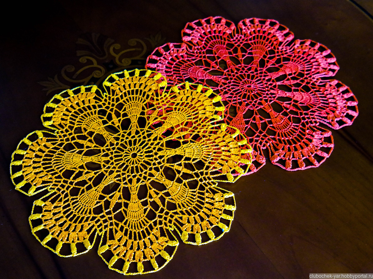 Две цветные салфетки, тонкие, ажурные, связаны из ниток "Ирис"