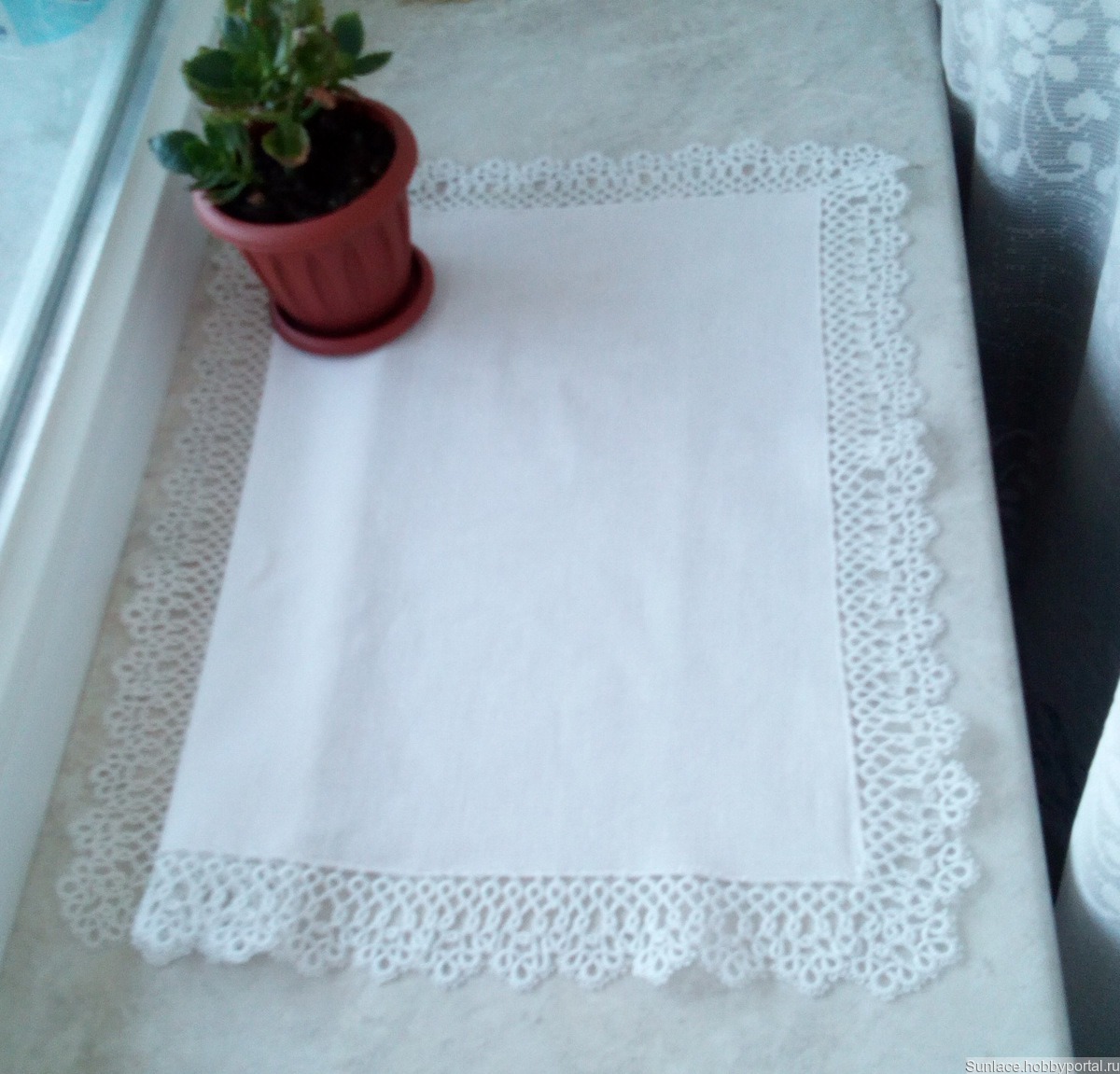 Тканевая салфетка с пришитой кружевной каймой. Кружево выполнено в технике фриволите.